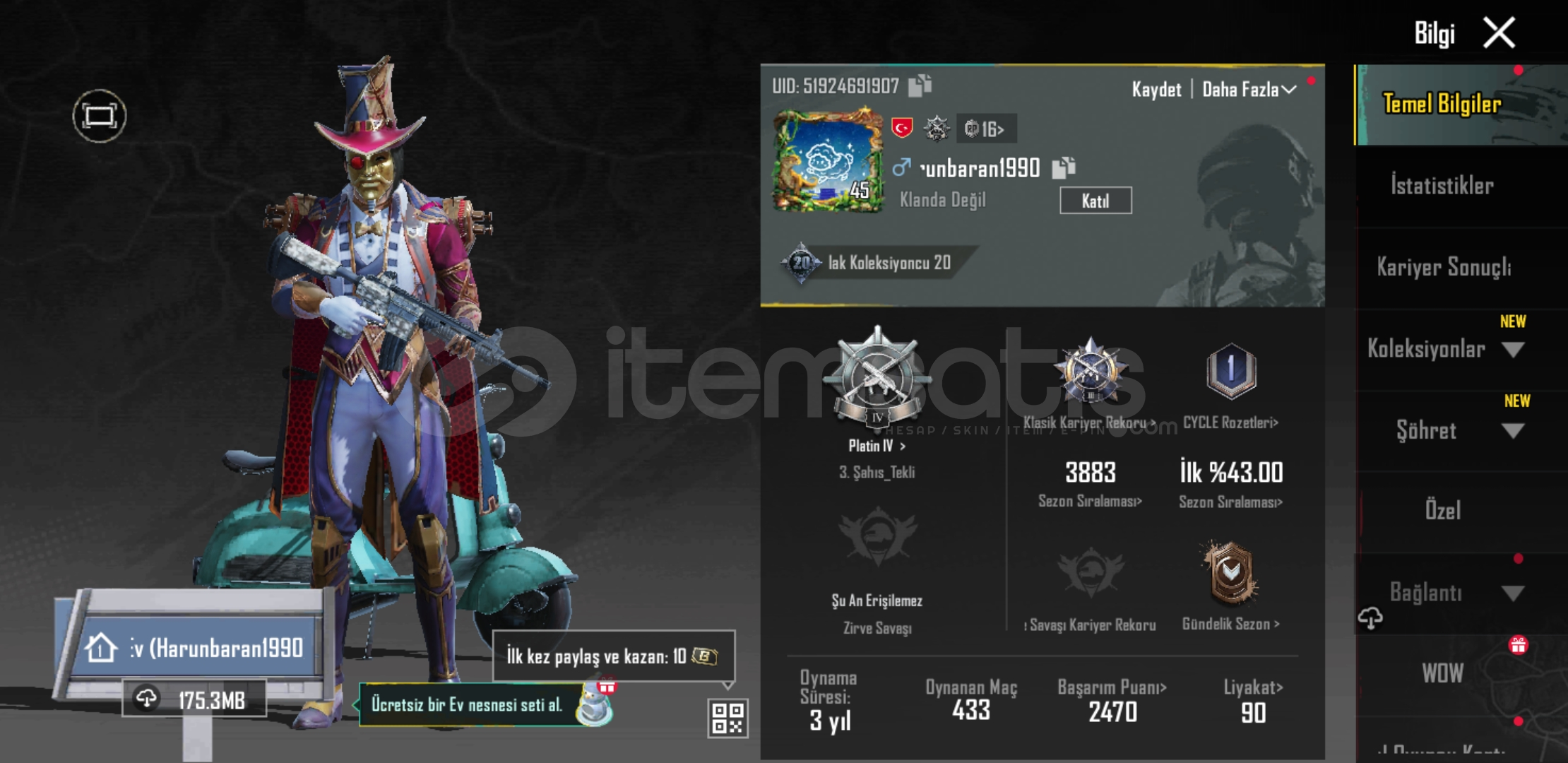 -HESAP BİLGİLERİ-44 Seviye-3 Yıllık-SÜRELİLERİ SAYMIYORUM-32 Set Var-9 Ayakkabı Modeli-14 Pantolon-2 Sırt Çantası-15 Üst-11 Yüz Maskesi-5 Gözlük-1 Başlık-Sadece Eposta Bağlı Ve Yeni Mail Zaten İsterseniz Mail Degisirim İsterseniz Maili Veririm