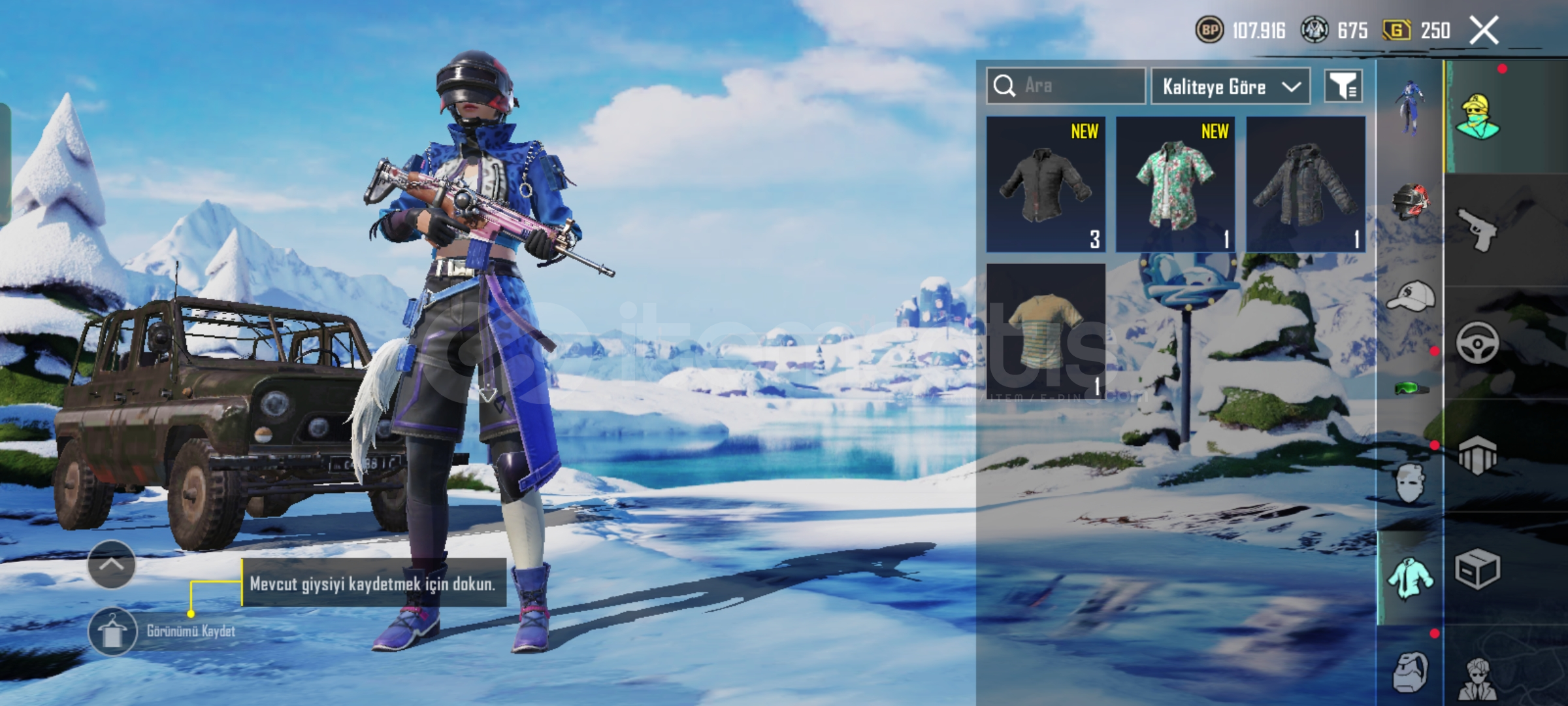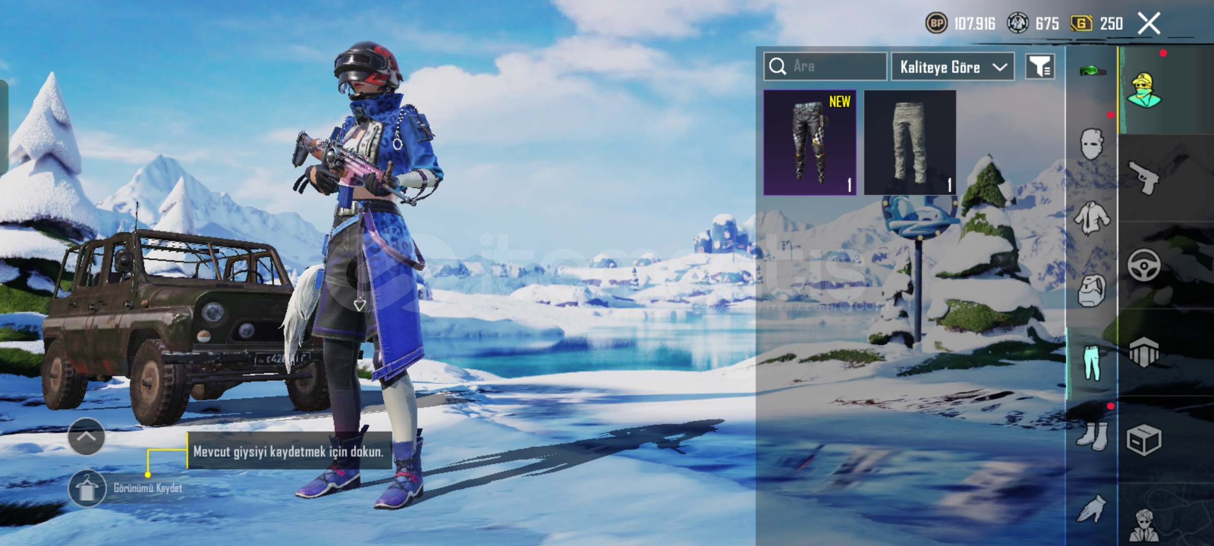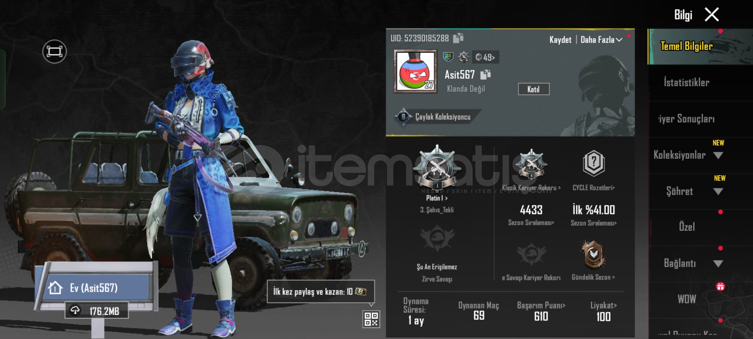 PUBG MOBILE HESAP SATILIK (Fiyat teklif usulü)Temel Özellikler:- UID: 52390185288- İsim: Asit567 (değiştirilebilir)- Seviye: 49- Klan: Yok (klansız)- Rank: Platin 1 (3. şahıs tekli)- İlk %400 (sezon sıralaması)- Zirve Savaşı: Şu An Erişilemez- Dinamo: 1 ay- Dinamo Maç: 69- Başarım Puanı: 610- Liyakat: 100Öne Çıkan Kostümler & Eşyalar:- Mavi Leopar Ceket Seti (tam set)- Kan ...