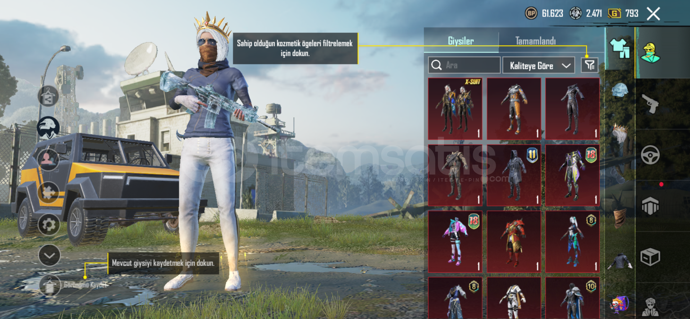 5 tane silah da öldürme mesajı var x suit komutan seti ve daha Birsürü kombin mevcut nadir kıyafetler mevcut güzel ...