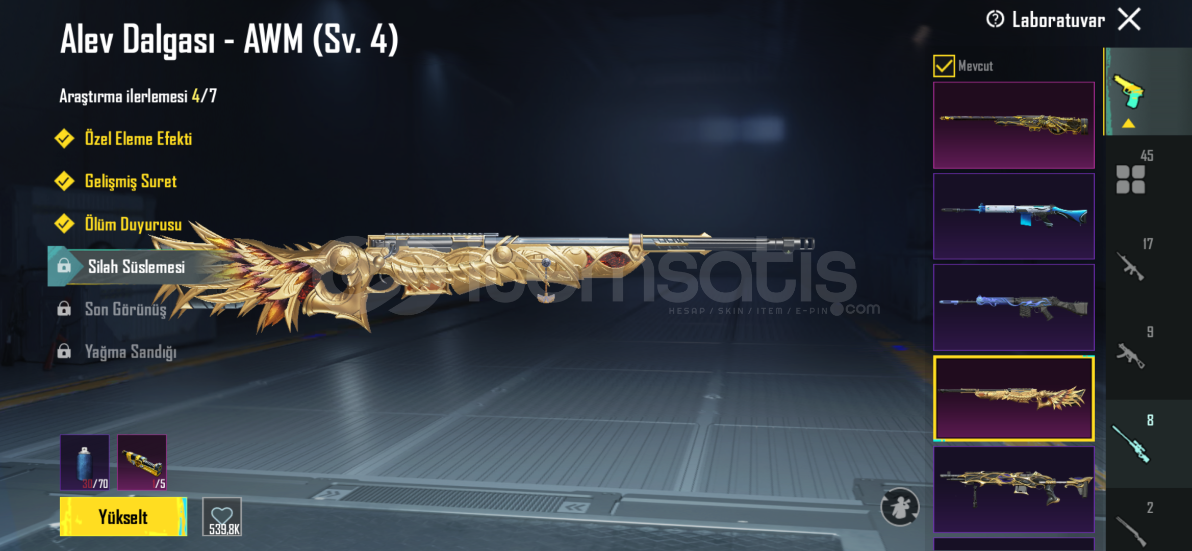 tüm silahlarda yükseltebilir skin var hemen hemen hepsi yükseltilmiş 45 adet