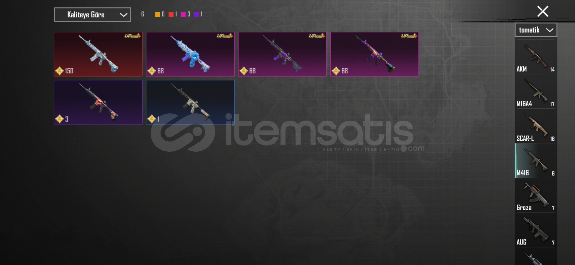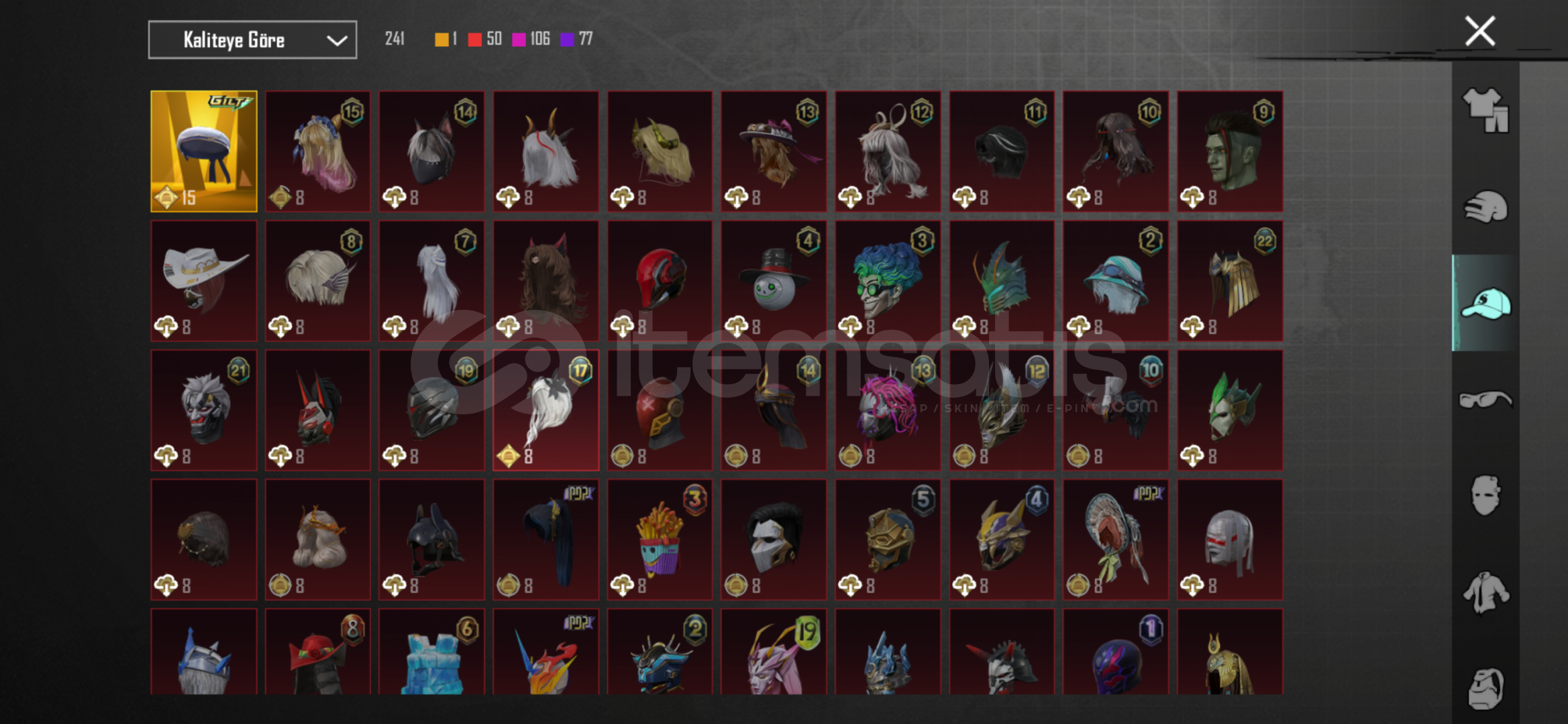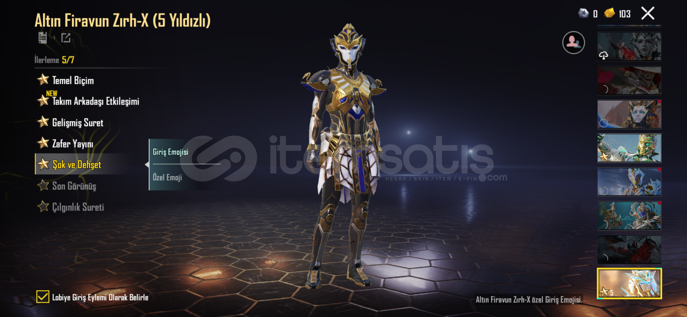 3 sezon Fatih eski çerçeve 5 seviye firavun 4 seviye silvanusToplam 9 adet X suitaraç desenleri mevcut sarı beyaz mumya tüm silahlarda yükseltebilir skin var hemen hemen hepsi yükseltilmiş 45 adetdikenli kask detaylı fotolar mevcut