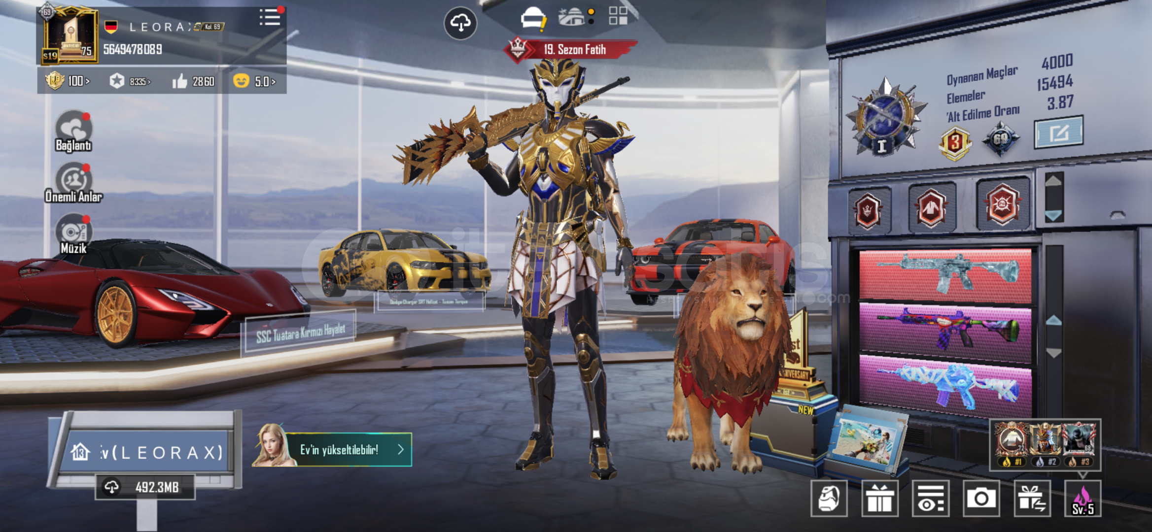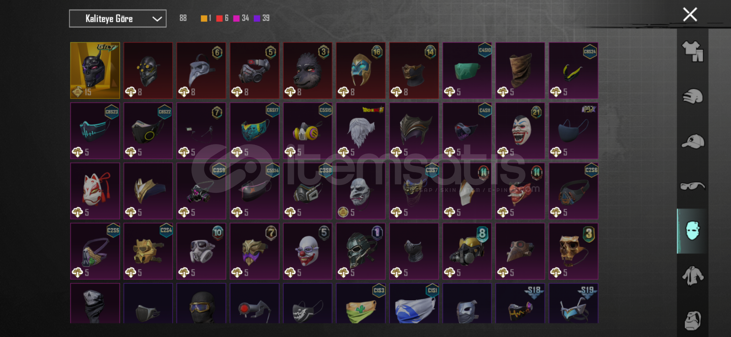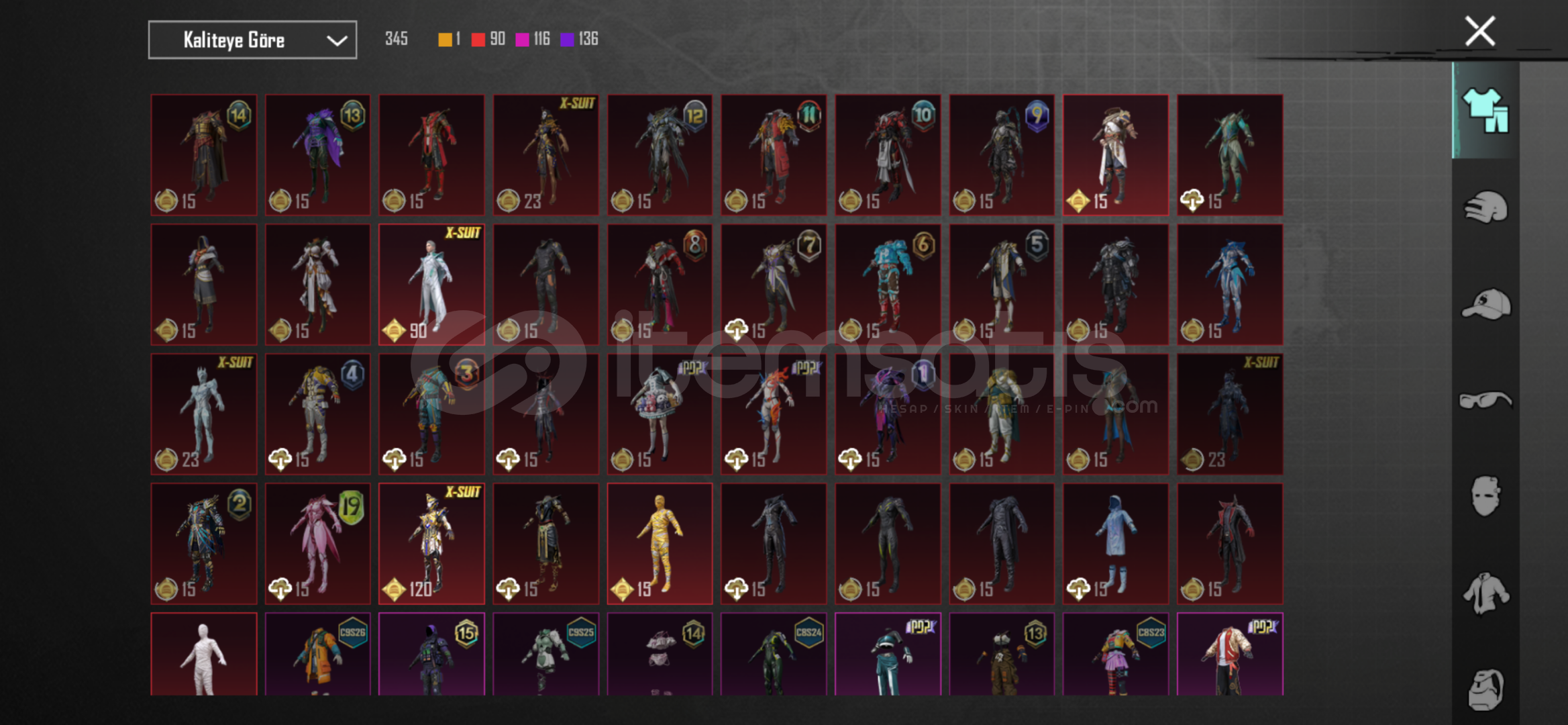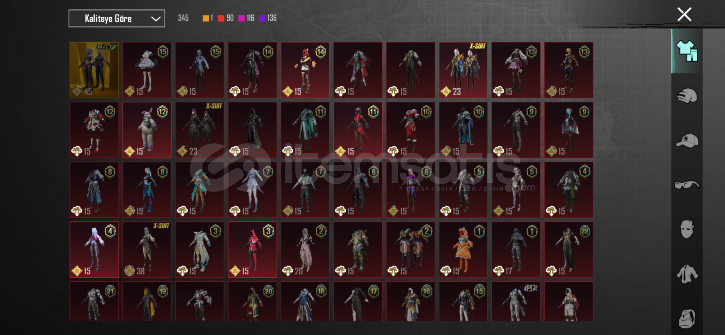 3 sezon Fatih eski çerçeve 5 seviye firavun 4 seviye silvanusToplam 9 adet X suitaraç desenleri mevcut sarı beyaz mumya tüm silahlarda yükseltebilir skin var hemen hemen hepsi yükseltilmiş 45 adetdikenli kask detaylı fotolar mevcut