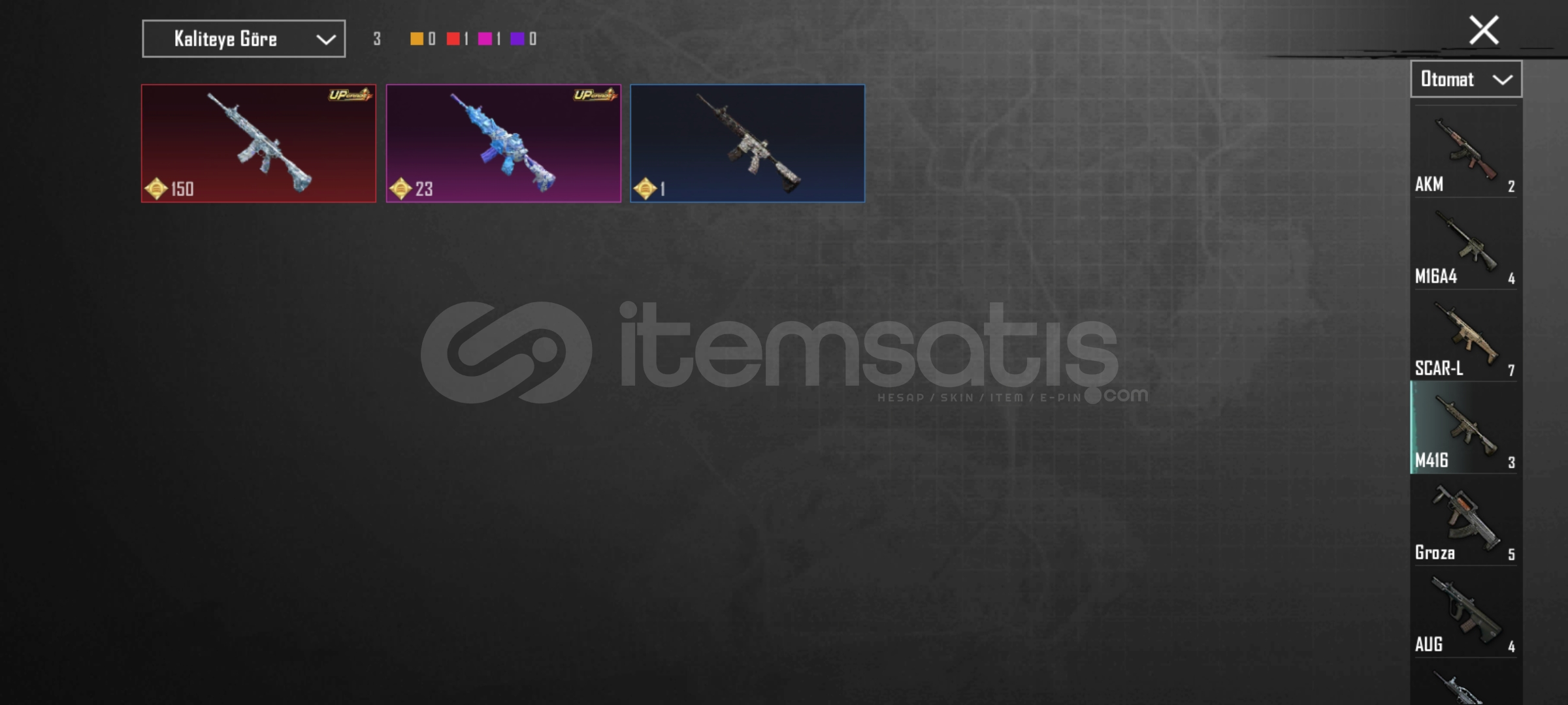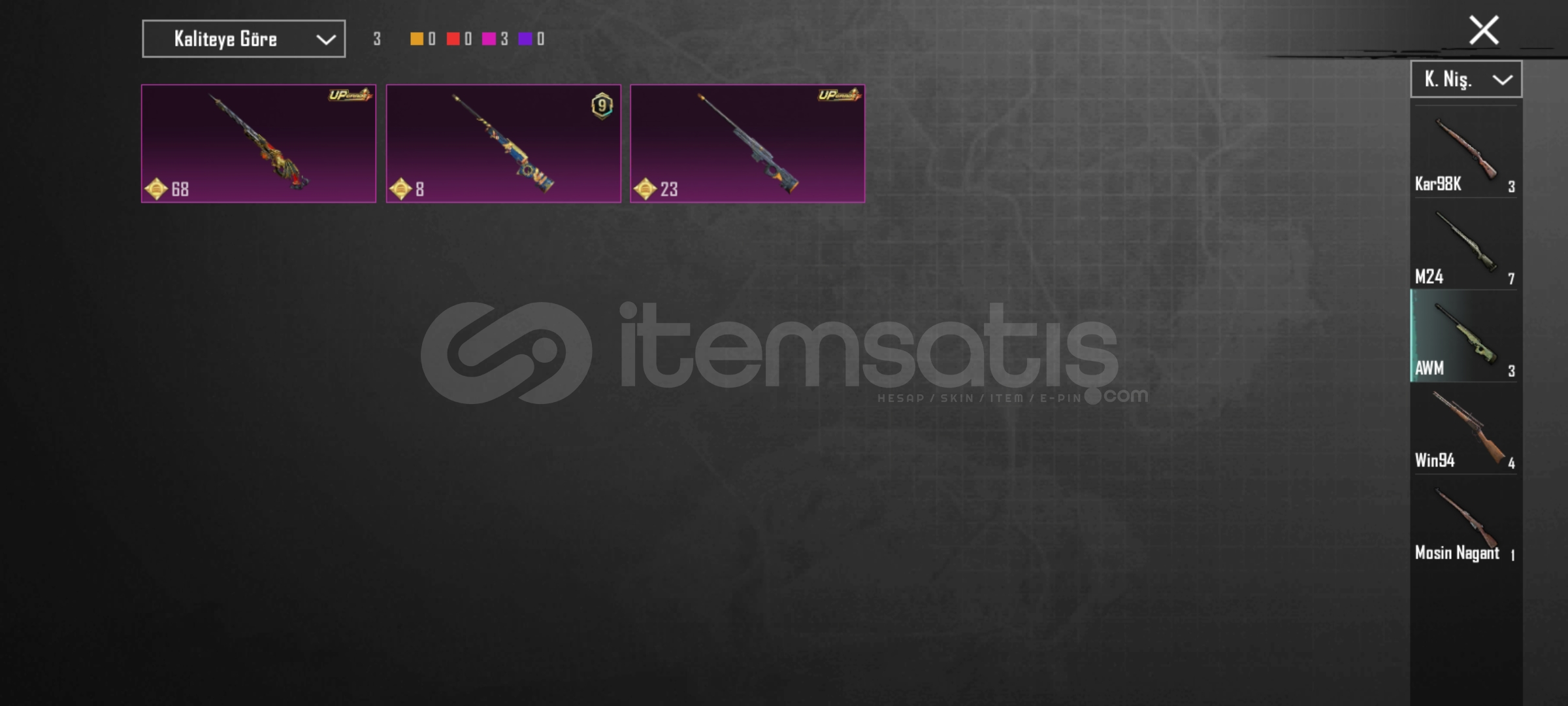 Buz diyarı M416 SV 7Deliliğin pençesinde SCAR-L SV 4Cehennem çığlığı AUG SV 4Kahramanlık ağıdı AWM SV 4Endüstriyel yırtıcı M24 SV 4Yaldızlı galaksi MK14 SV 4Küçük midilli M762 SV 4Kasvetli av S1897 SV 48 Bitlik patlama UMP SV 4Atomik tetik S12K SV 4Deniz rüyası melodisi SLR SV 3Ruhani Muhafız UZİ SV 3Tundra şovalyesi hançeri SV 3Diğer 21 silah s...