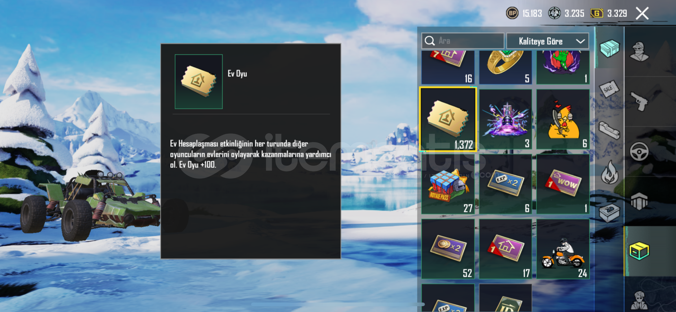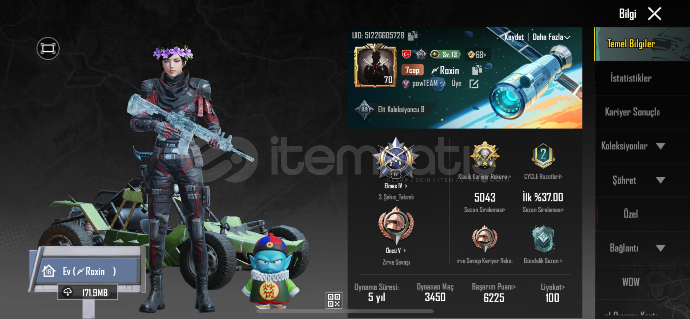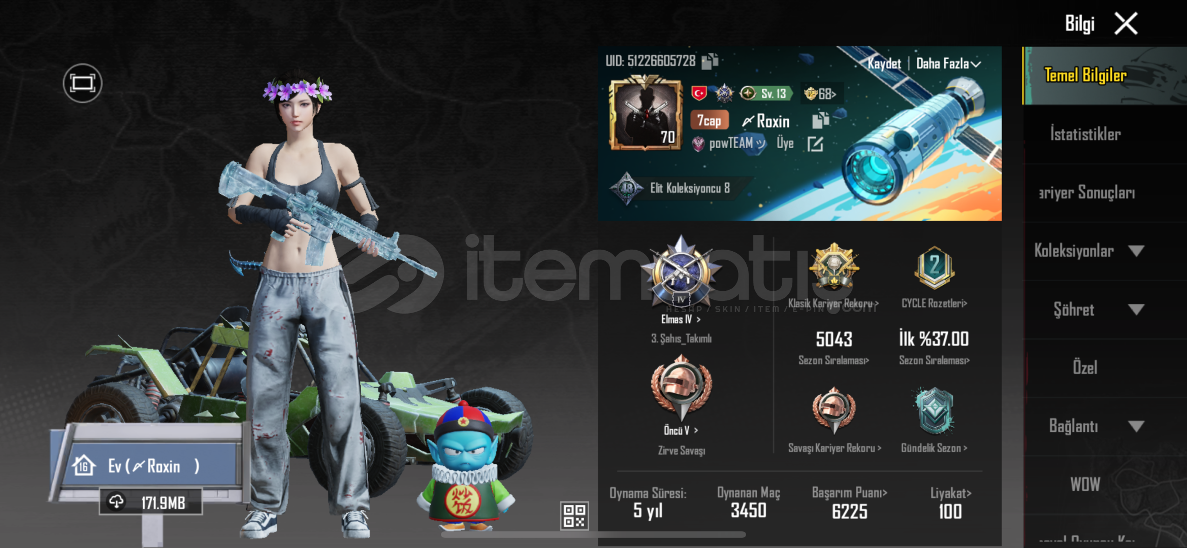 Hesabın envanterinde ID kartı, 1 Adet Materyal, 1350 Ev oyu ve ortalama 15K popülerlik vardır.