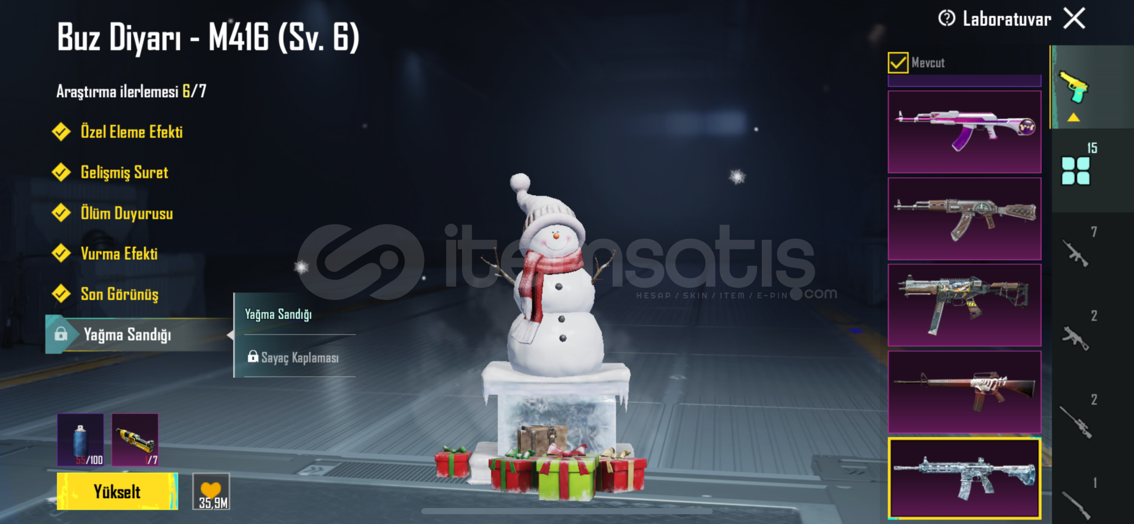Hesapta 6 Sv Buz diyarı ve buna ek olarak 14 adet geliştirilebilir silah deseni var. (Royale Pass ve Premium sandıktaki silahlar.)