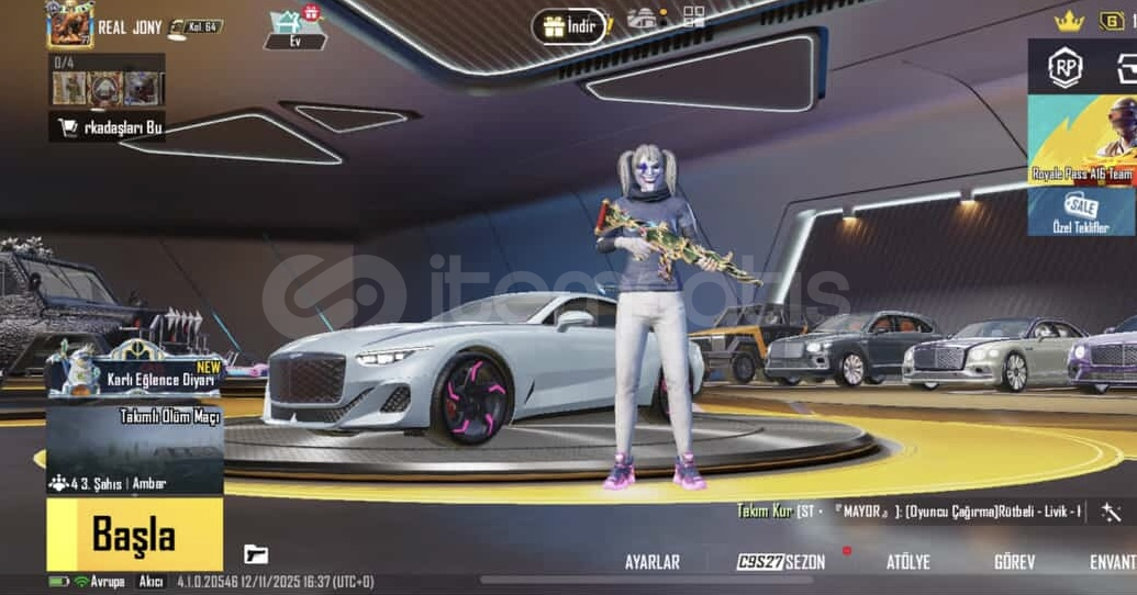 +bide hesapta royal pass açık + 600 uc mevcuttur rp fullenirse 1000 uc yi geçer