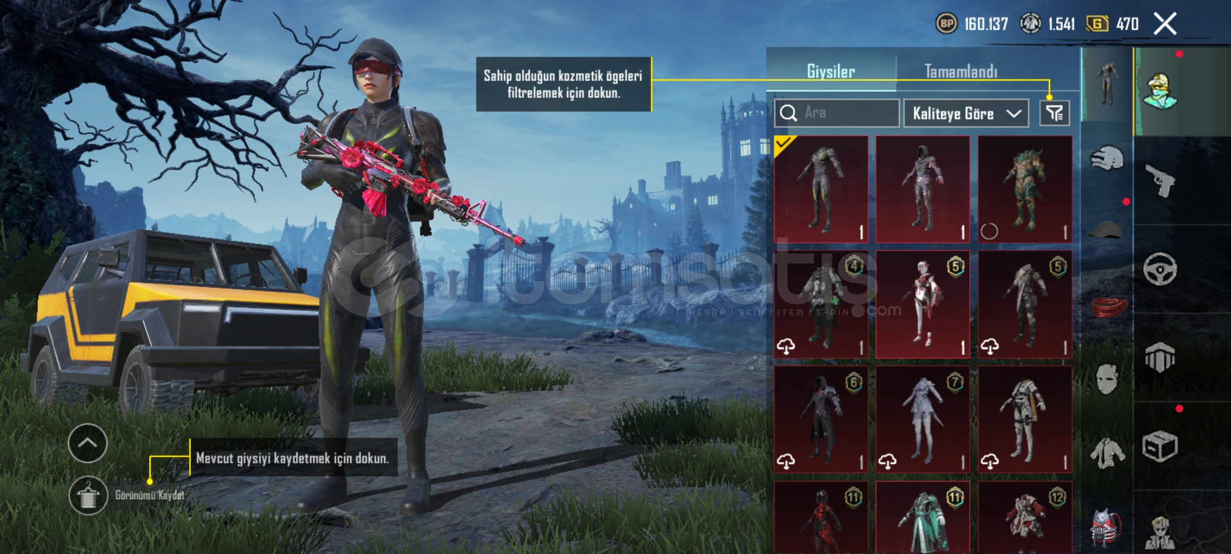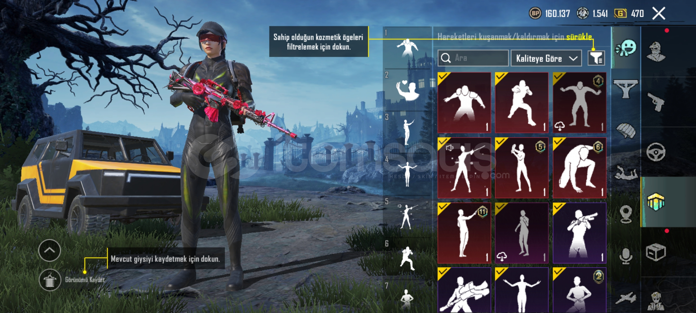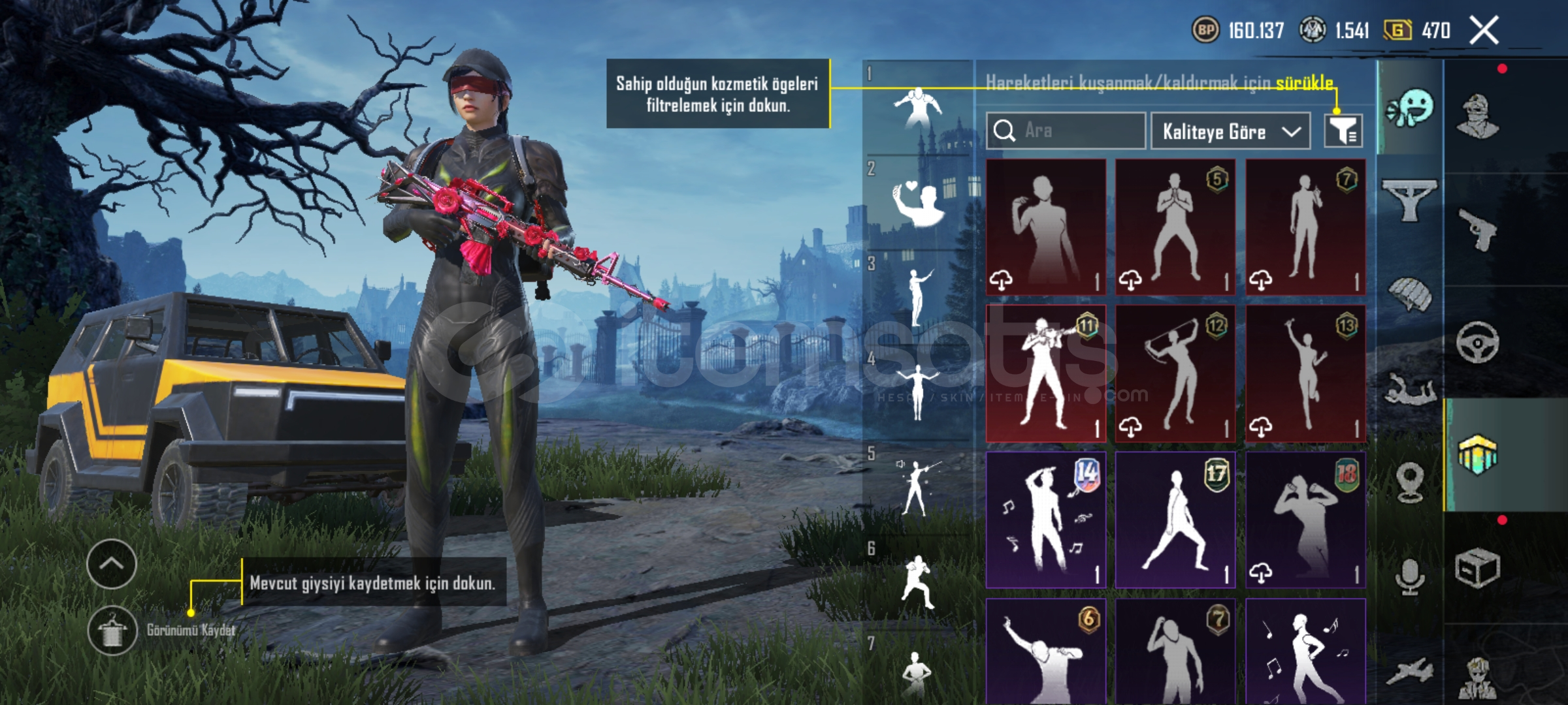 Hesapta ne ararsan var yükseltilebilir silah var yükseltilebilir araba var 40 emojiyi geçik var çanta 8-9 tane kaskta aynı şekilde işgalci seti var nadir şeyler var ne ararsan var