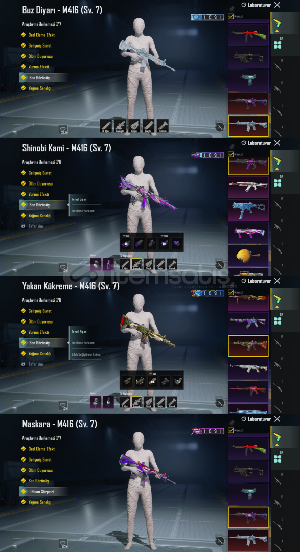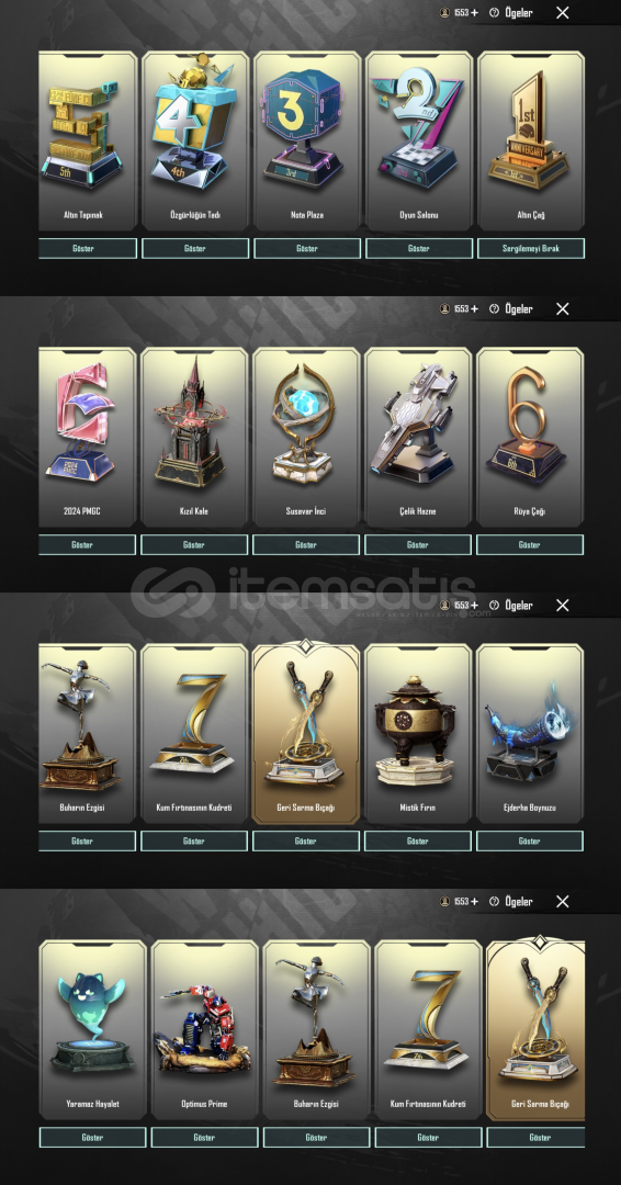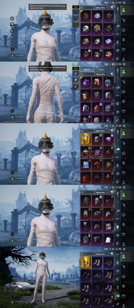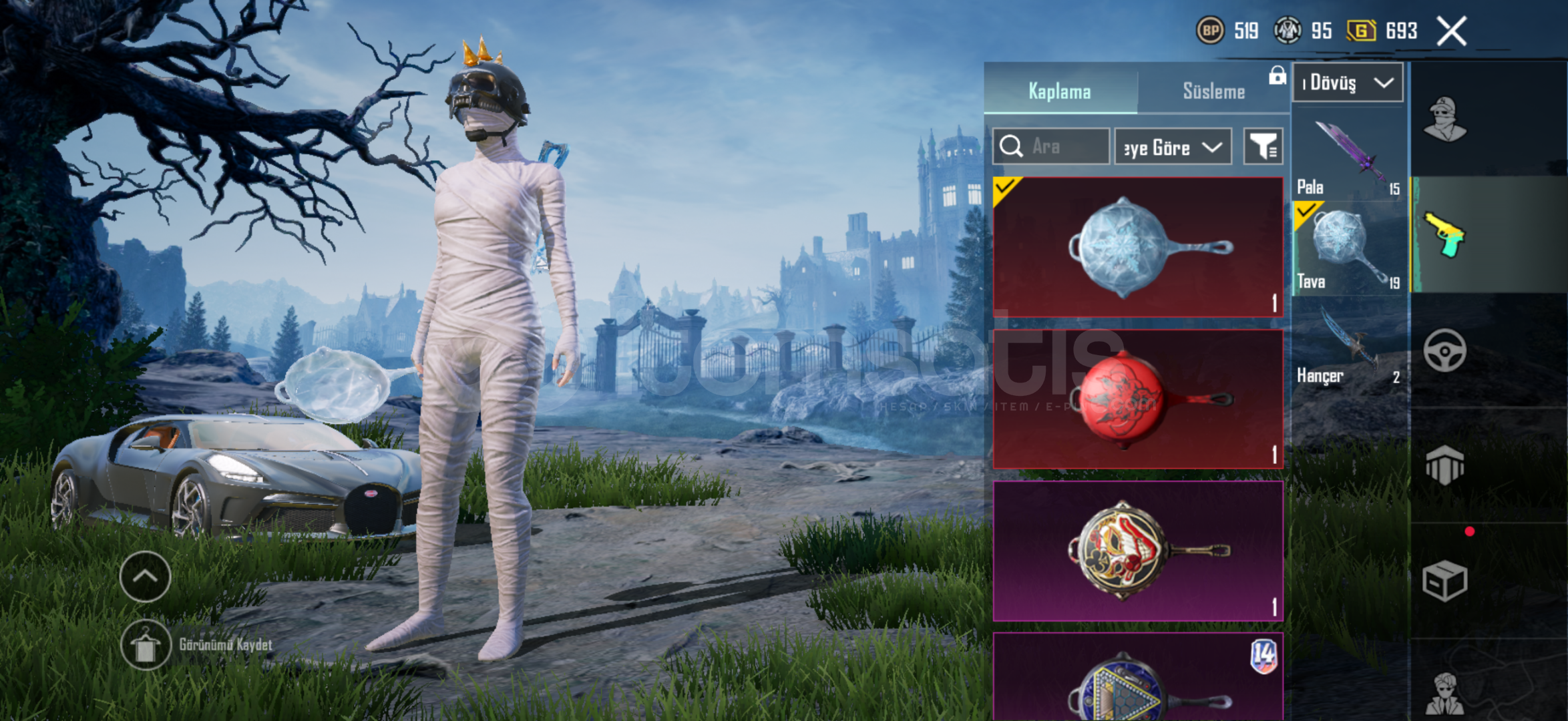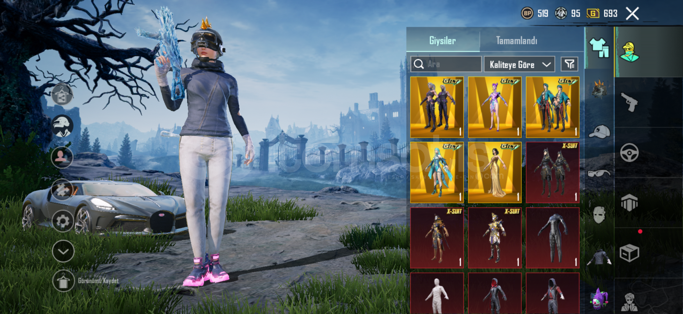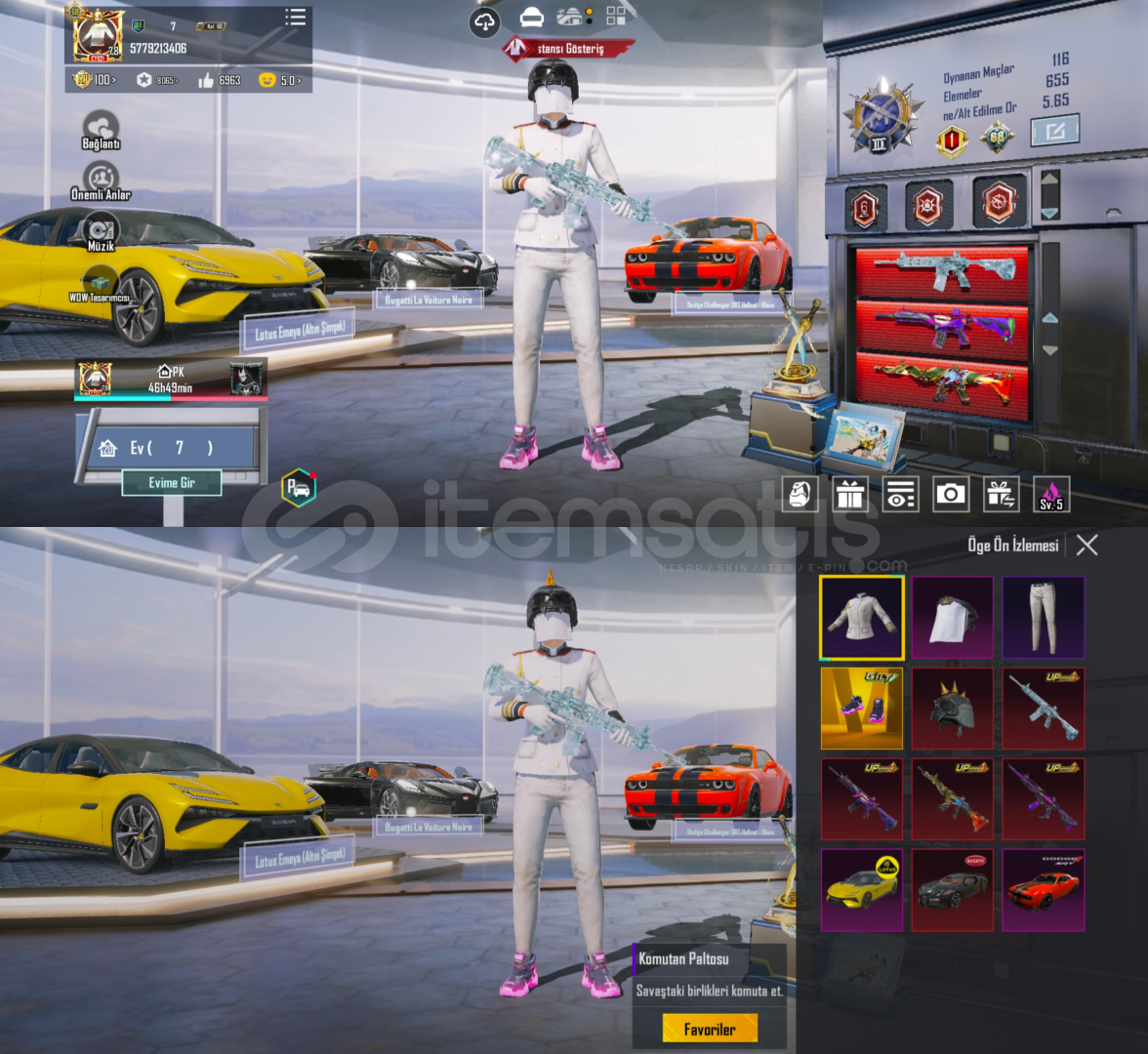 Dikenli kask,bugatti spor araba ve 3 adet araba,firavun 3 seviye,4 adet m416 7 seviye,2 adet destansı tava,4 adet yoldaş,ayı,leopar,kartal,köpek,maskara çantası gibi değerli eşyalar bulunmaktadır.