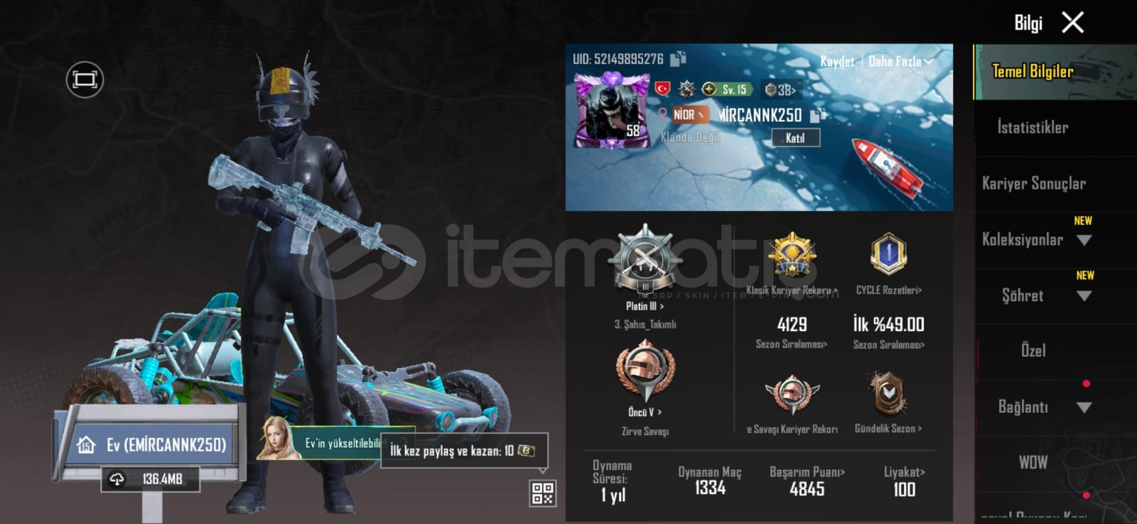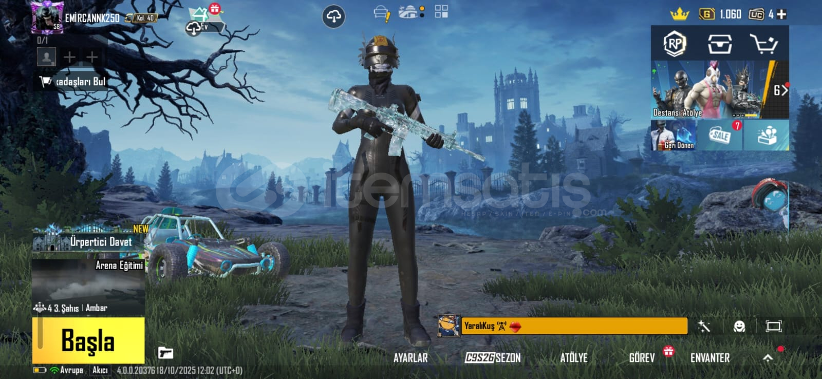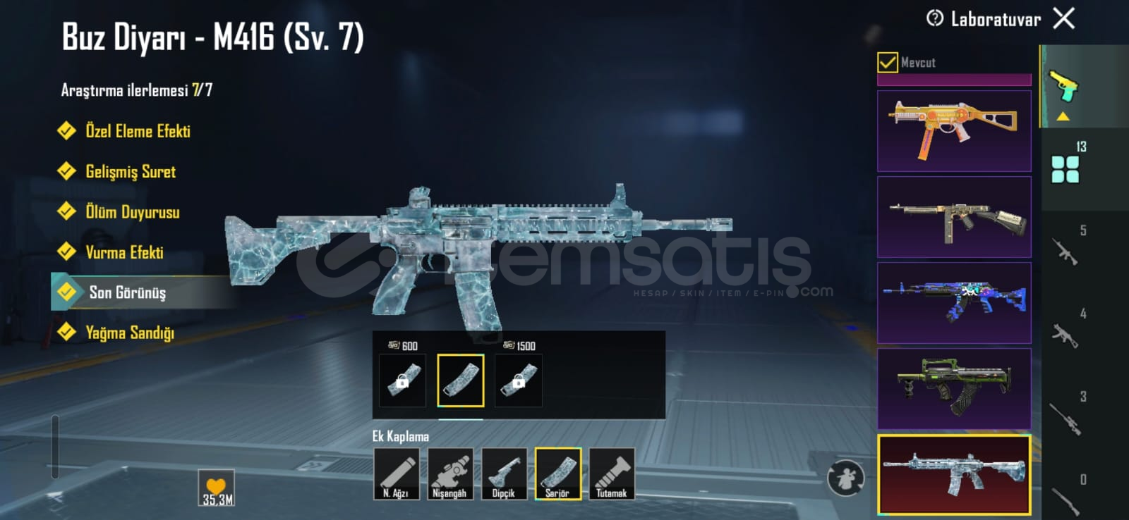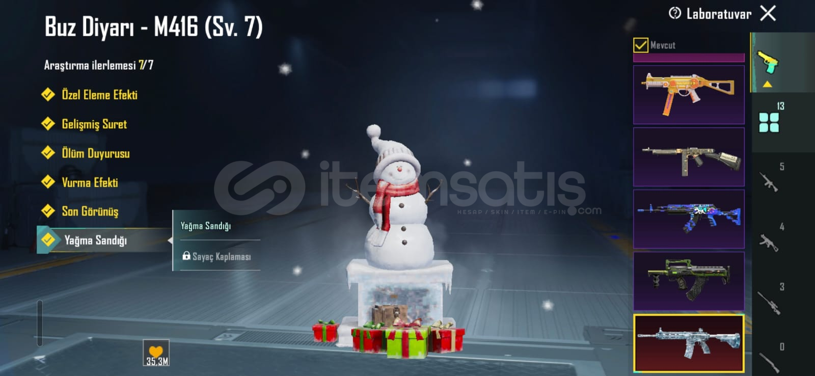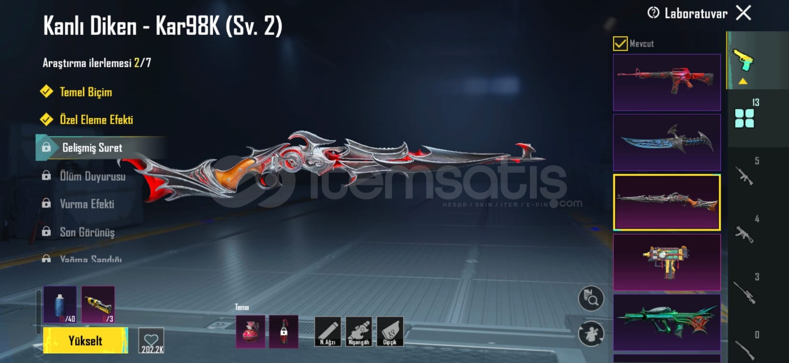 13 TANE YÜKSELTİLEBİLİR SİLAHBuz Diyarı M416 7 SeviyeDerin Deniz Dehşeti Aug 4 SeviyeKüçük Midilli M762 3 SeviyeGece Gladyatörü PP19 3 SeviyeDeniz Rüyası Melodisi SLR 3 Seviye Ruhani Muhafız UZI 3 Seviye Kanlı Diken Kar98K 2 Seviye hesapta eposta bağlıdır.detaylı bilgi isteyen yazabilir.