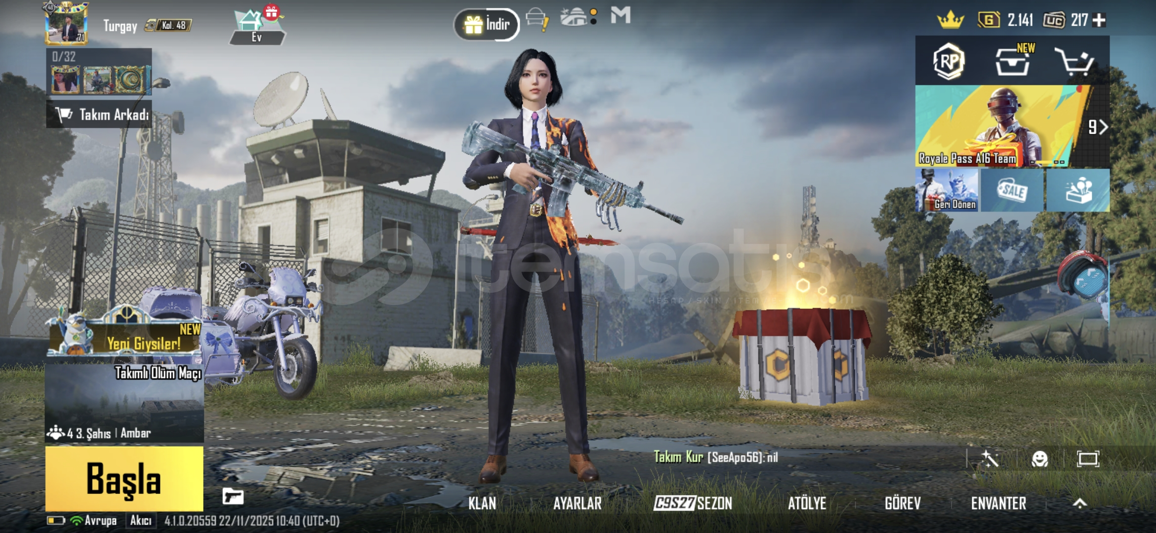 Hesabım 3. Sezon hesabıdırDestansı gösteriş ve fatih ünvanı vardır11 tane yükseltilebilir silahYükseltilebilir sedan son seviyeYükseltilebilir uaz Yükseltilebilir motosiklet varUmp uzi m762 m4 bıçak gibi sık kullanılan silahların ölüm duyurusu varHesapta mevcut 200 uc varHiç bir bağ ölü degildir hepsini devredicem