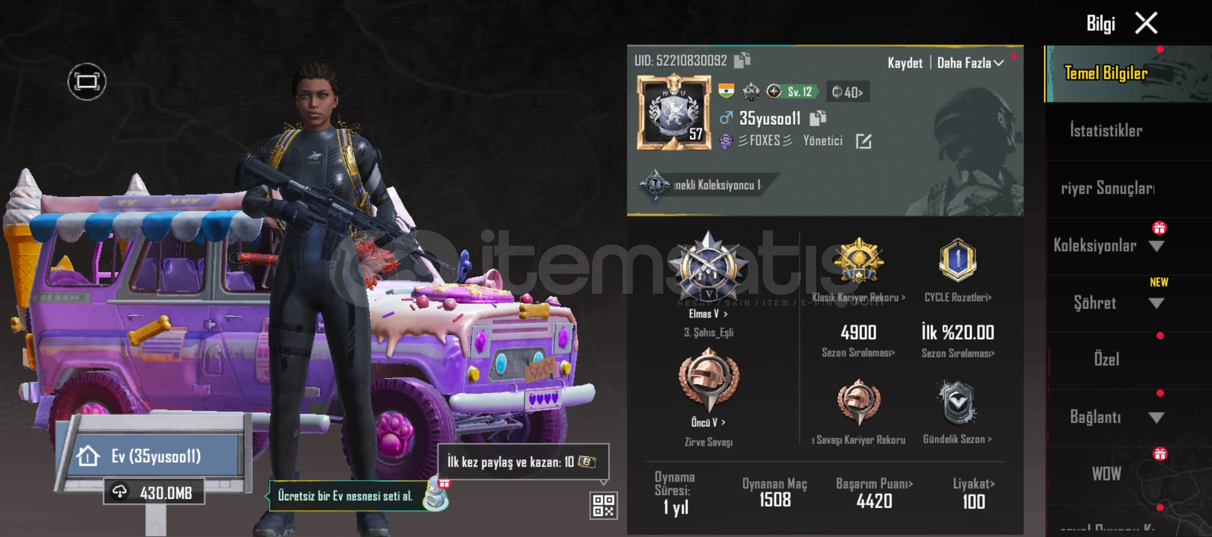 Hesapta 7 Yükseltilebilir VardırDalgiç Seti VardırHesap 57 SeviyedirEmek HesabıdırFiravun Çantasi VardırAn...
