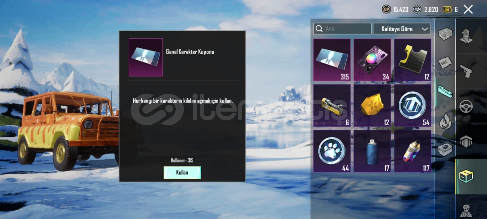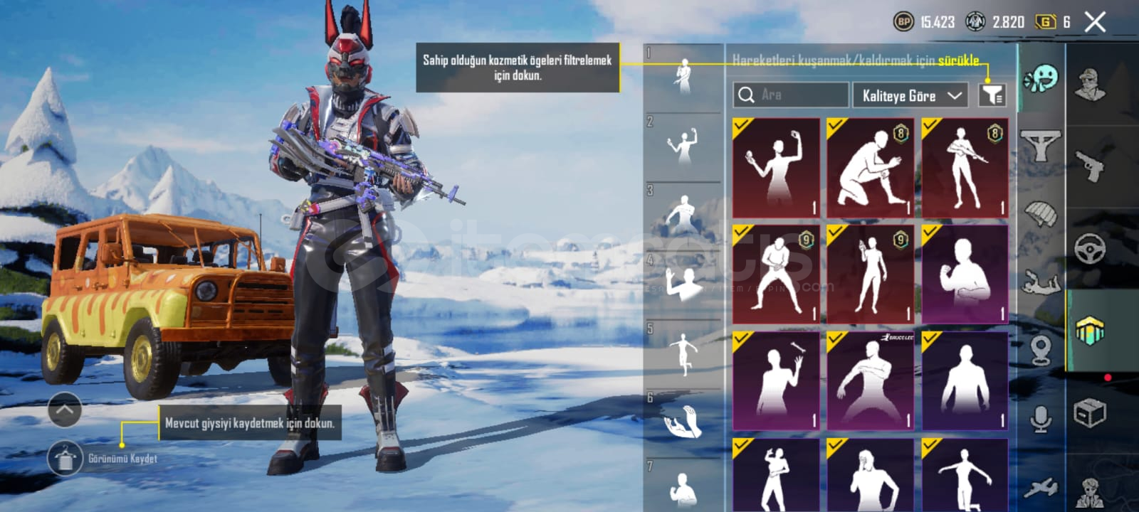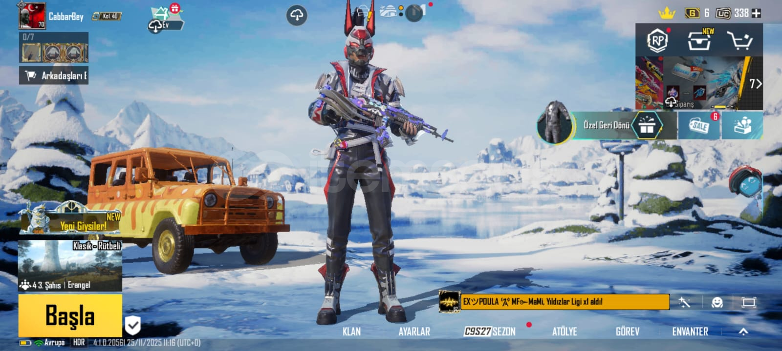 17 adet 1 günlük oda kartı1 adet 1 günlük WOW oda kartı4 adet 7 günlük oda kartı1 adet Nick değiştirme kartı338 UC2800 gümüş parçacık 🔹 Özellikler & Envanter3 adet yükseltilebilir silah:M7 (3 seviye)SLR (1 seviye)Uzi (2 seviye) 5 adet destansı kıyafet4 adet destansı başlık5 adet destansı hareketToplam 85 adet silah deseniAraç desenleri:1 adet UAZ...