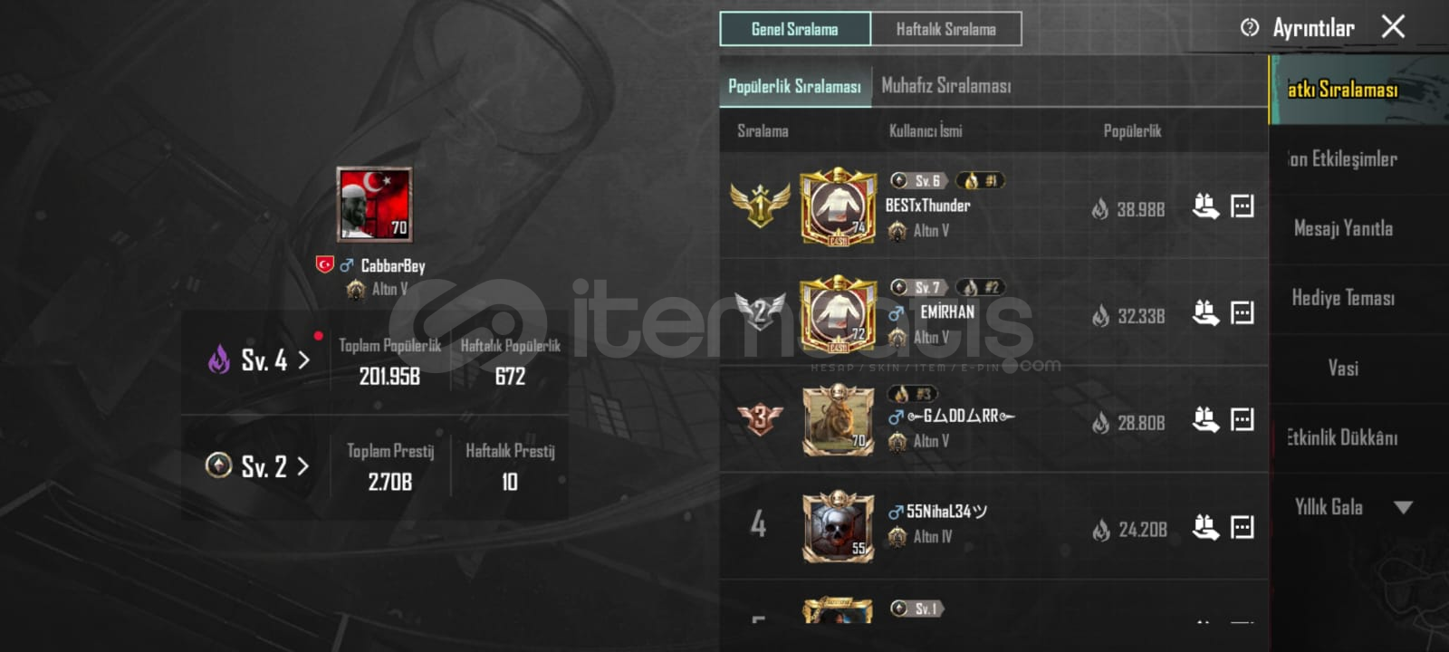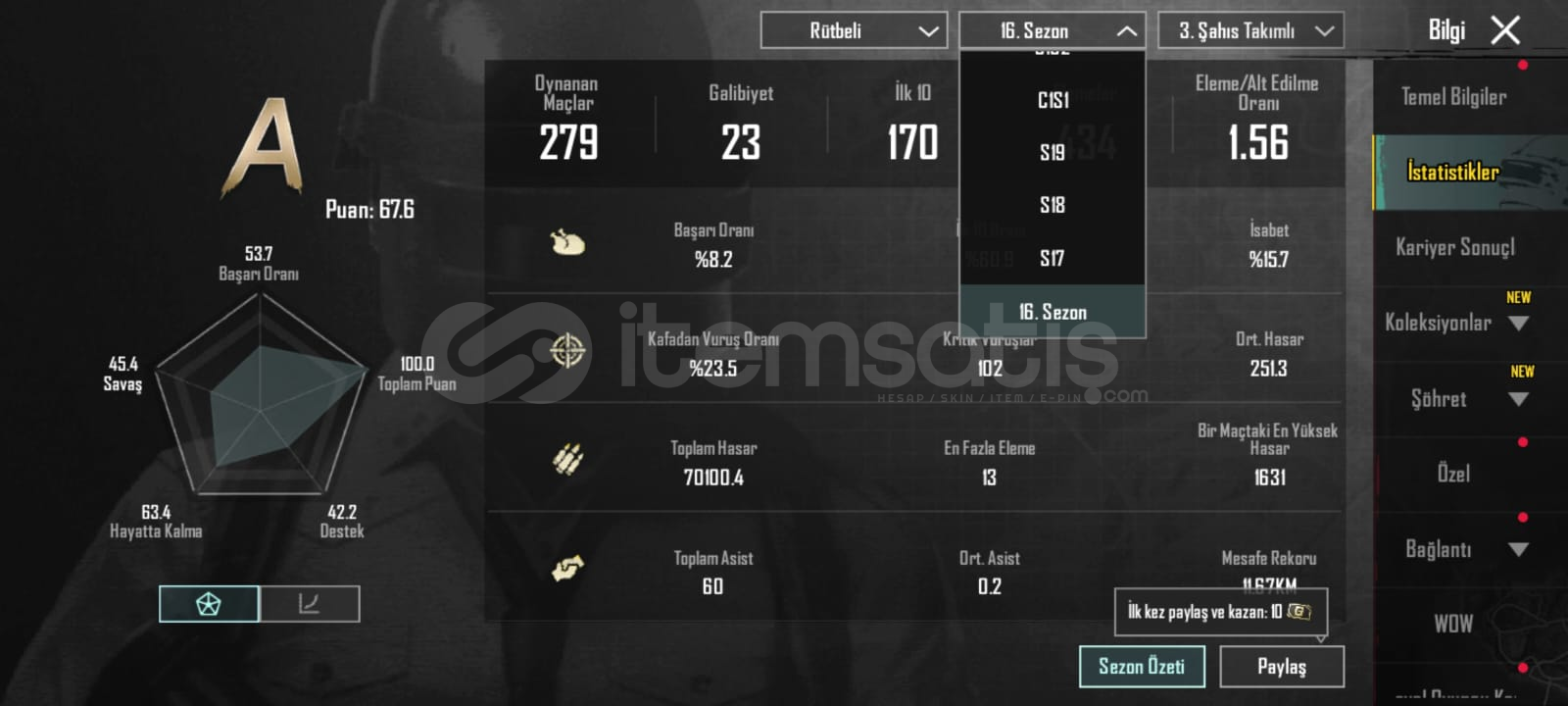 70 SEVİYE 16.SEZON PUBG MOBILE HESABI