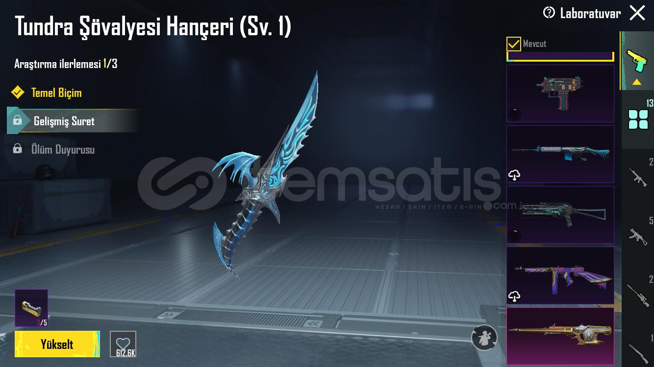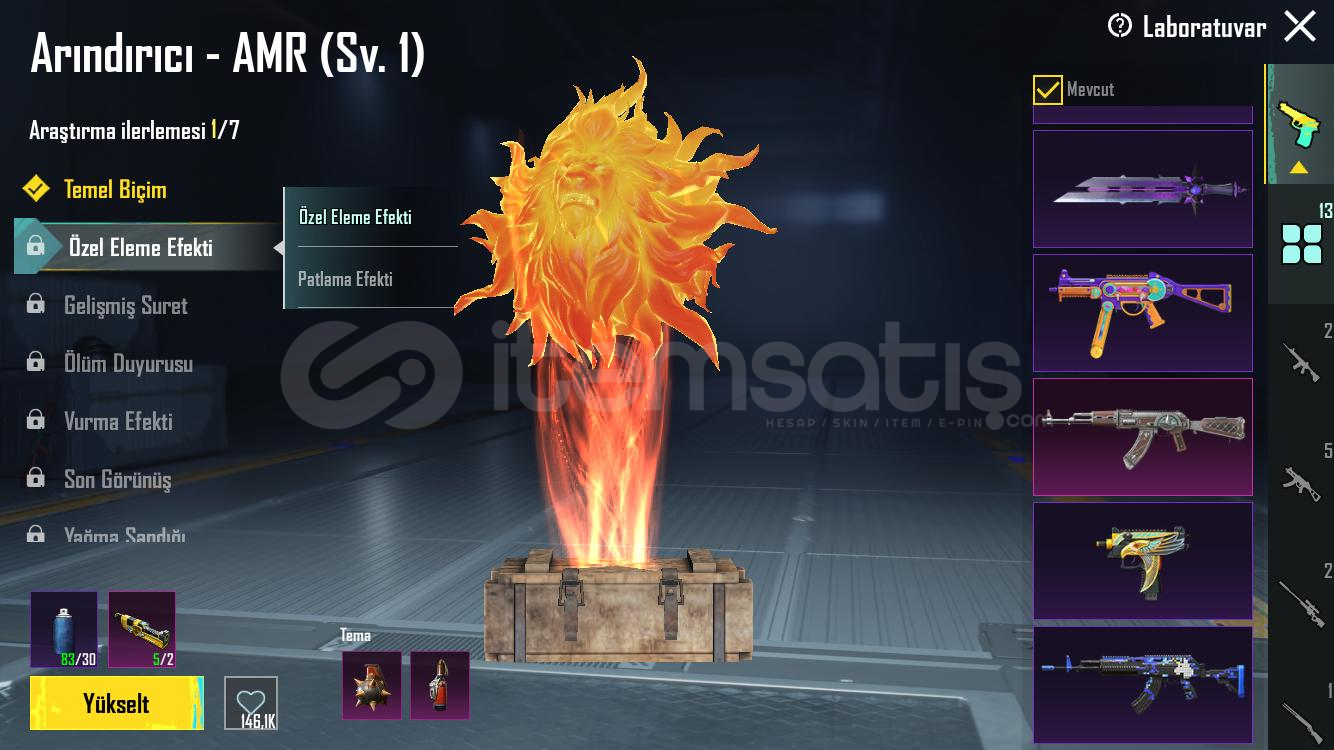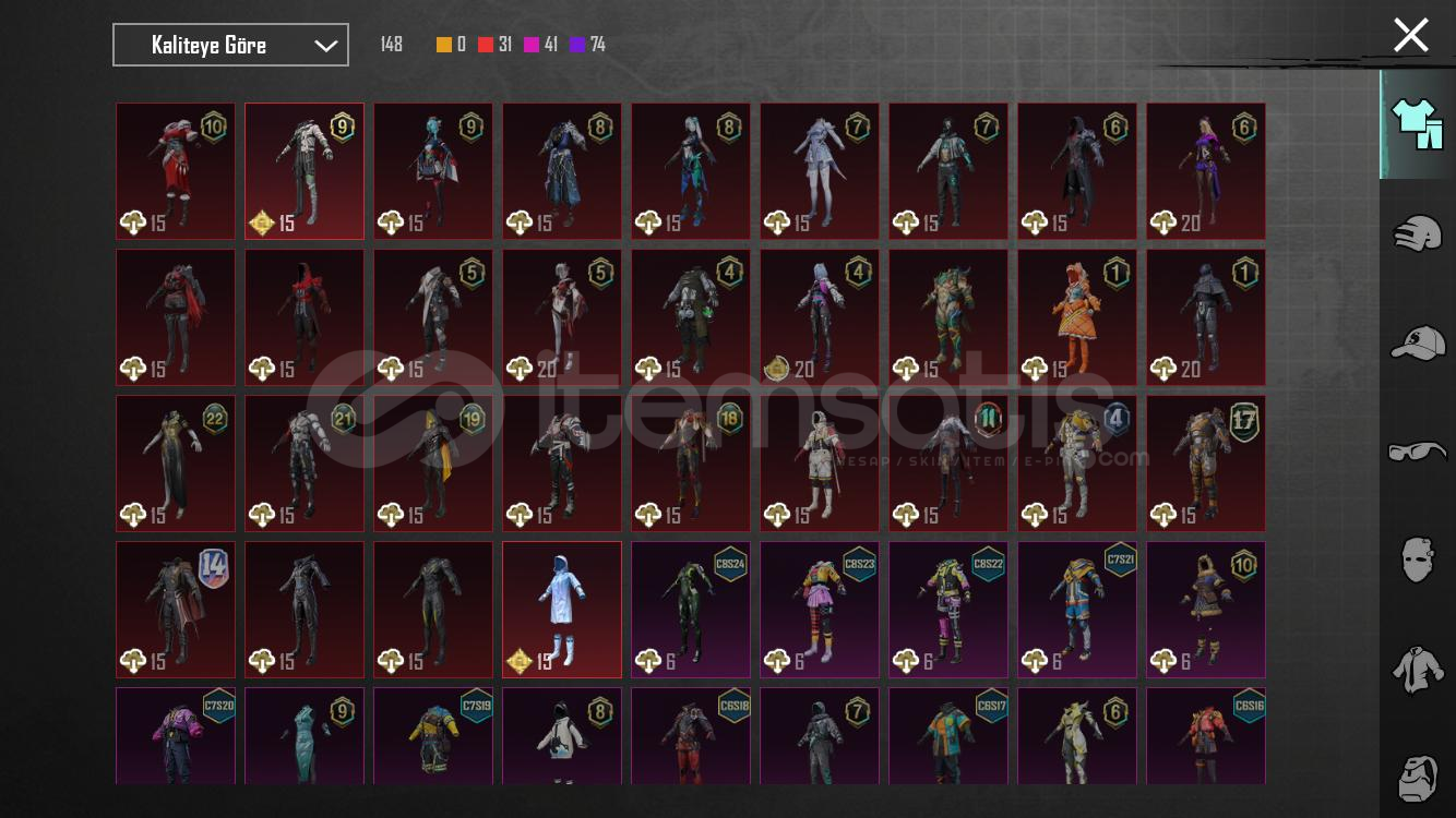 SilahlarKod kırıcı AKM 2 svyMidilli m762 2svyGöksel işaret uzi 4 svy8 bitlik patlama ump 4 svyArındırıcı amr 1 svyKalan 8 i RP silahları5 meteryal 2 destansı amblem varXsuit yok
