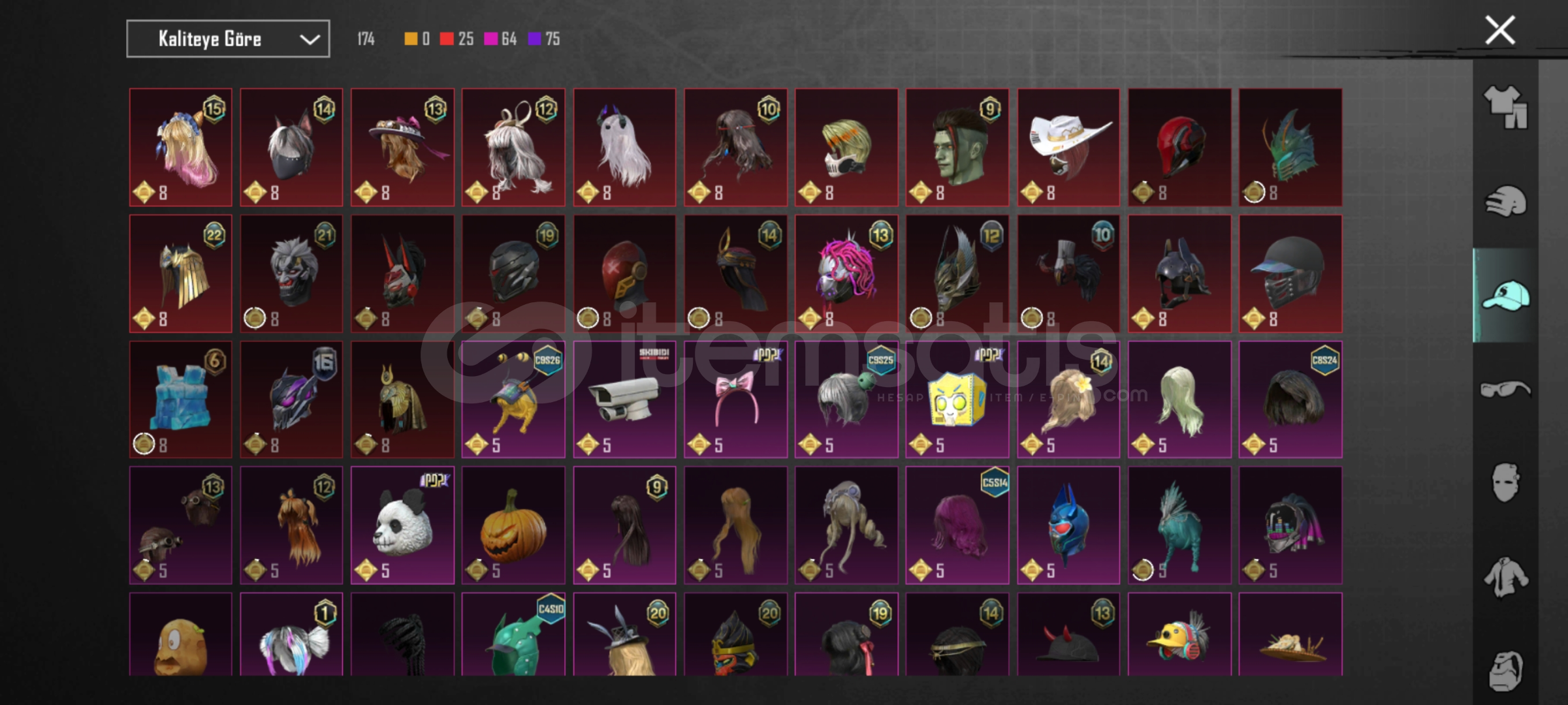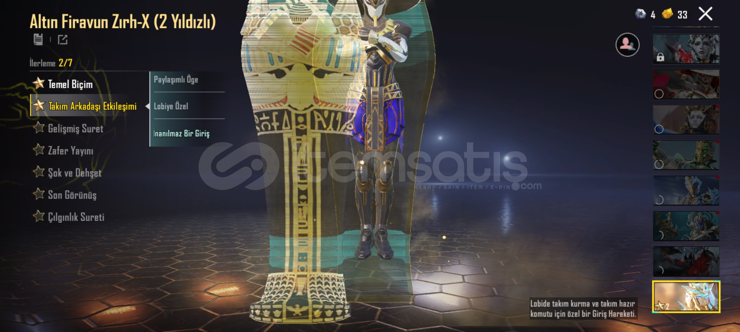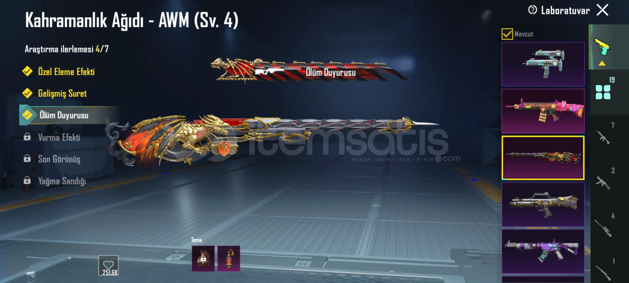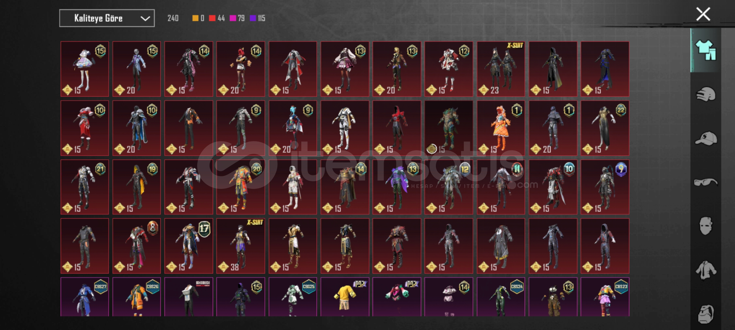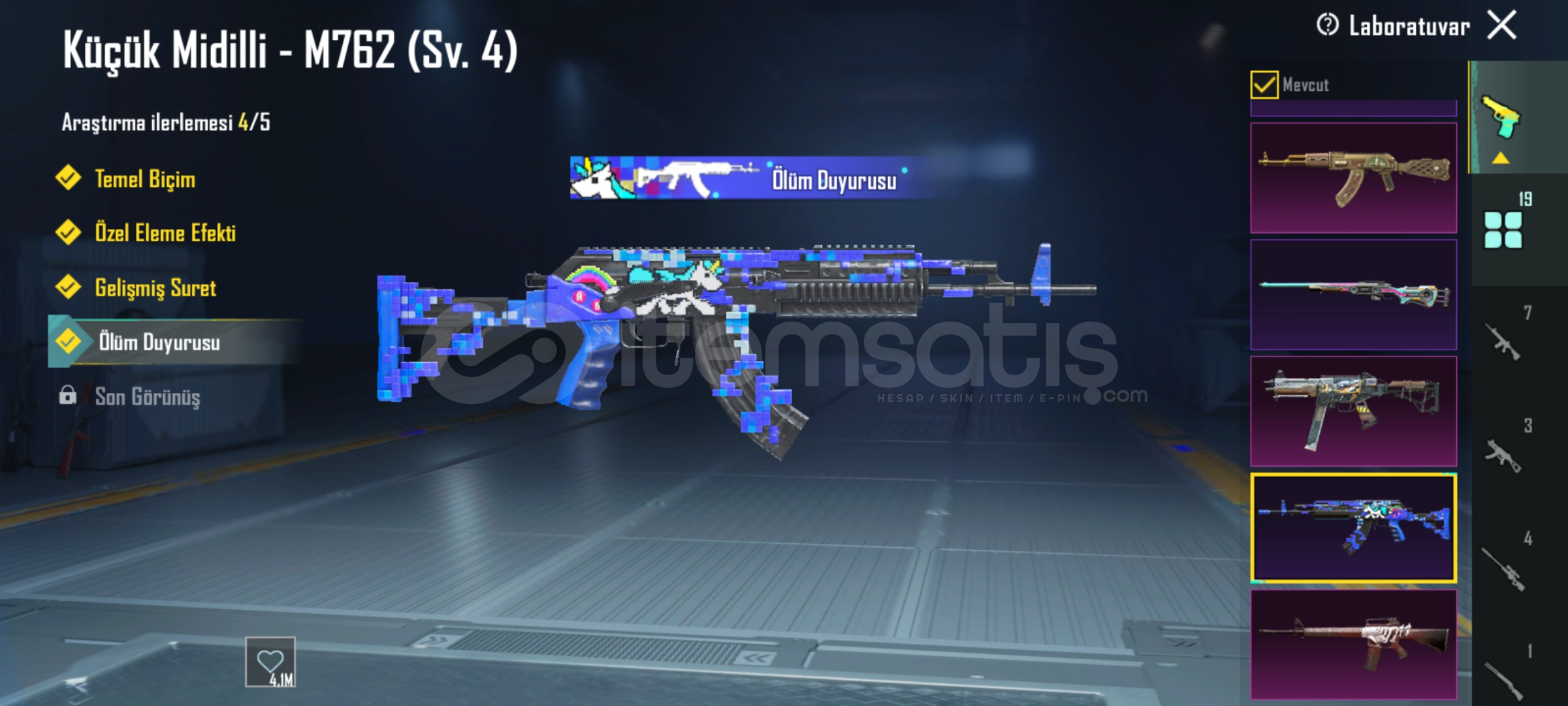 UCUZ FIRSAT HESABI!!! Firavun x suit 2 seviye Anukhra x suit 1 seviyeAWM 4 seviye AKM 4 seviyeM762 4 seviyeM24 4 seviye Uzi ölüm duyurusunda Pala ölüm duyurusundaScar-l ölüm duyurusundaHesapta 19 adet yukseltilebilir silah deseni bulunuyor