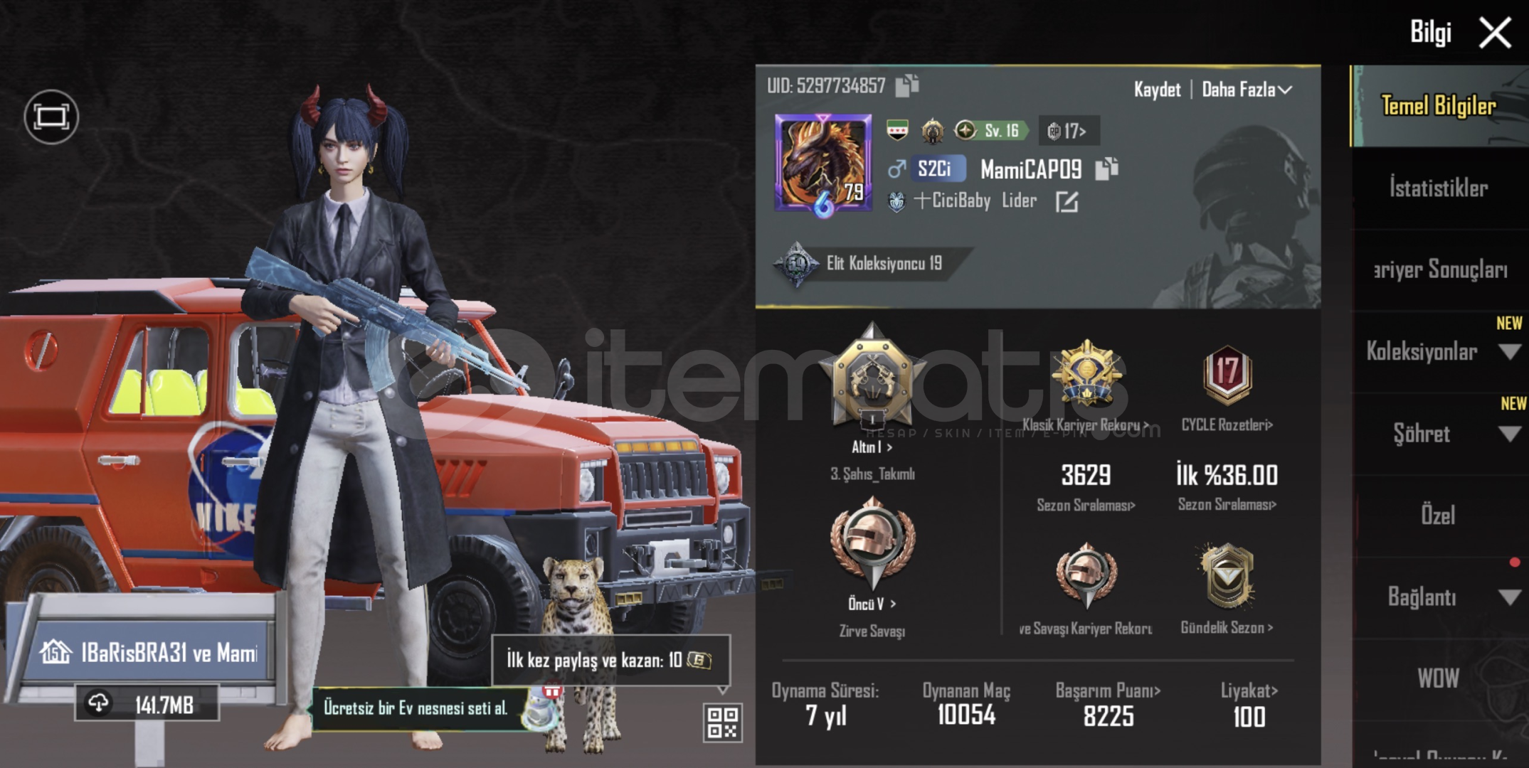 hesabı görüyorsunuz bi bu kadarda içerde varKoleksiyon 6013 YÜKSELTİLEBİLİRKalkan uaz5 seviyekalkan motor 1 seviye22 sezon rp açılmıştırcarlo ve andy açıktırKomutan fullMavi şort üst fullS4 saçsiyah şort üst full1 tane modifikasyon parçasıdetaylı bilgi için İD alta bakabilirsinizÖMÜRLÜK GARANTİLİID:5297734857