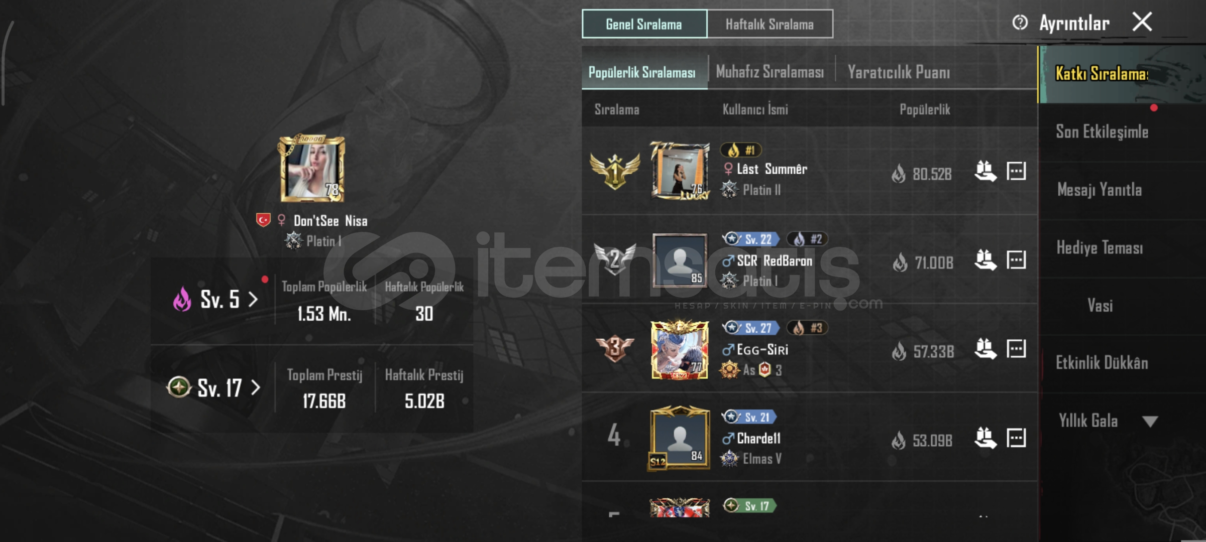 Hesap Fazlasıyla Doludur 58 Koleksiyon Seviyesi Vardır 17 Adet Yükseltilebilir silah mevcuttur 1.5M Popülerliği Vardır 191 Günlük Oda Kartı Vardır Hesabın Seviyesi 78dir6 Yıllık Bir Hesaptır Bir Sürü Değerli Emojisi Vardır Geçen Sezon Rp Fullenmiştir Alan Veya Almayı Düşünen Herkese Şimdiden Hayırlı OlsunTelefon Ve Mail DeğişecektirUfakta Olsa Pazarl&...