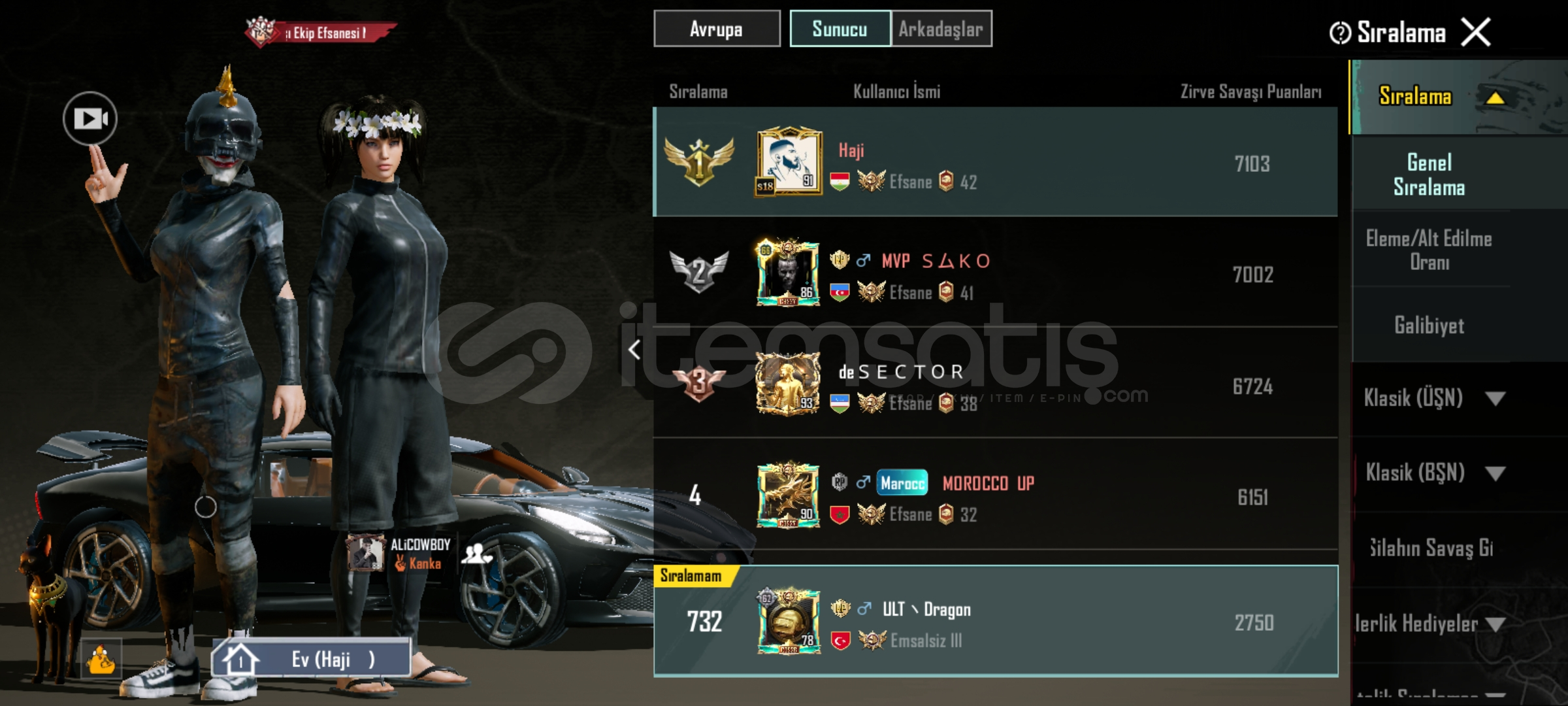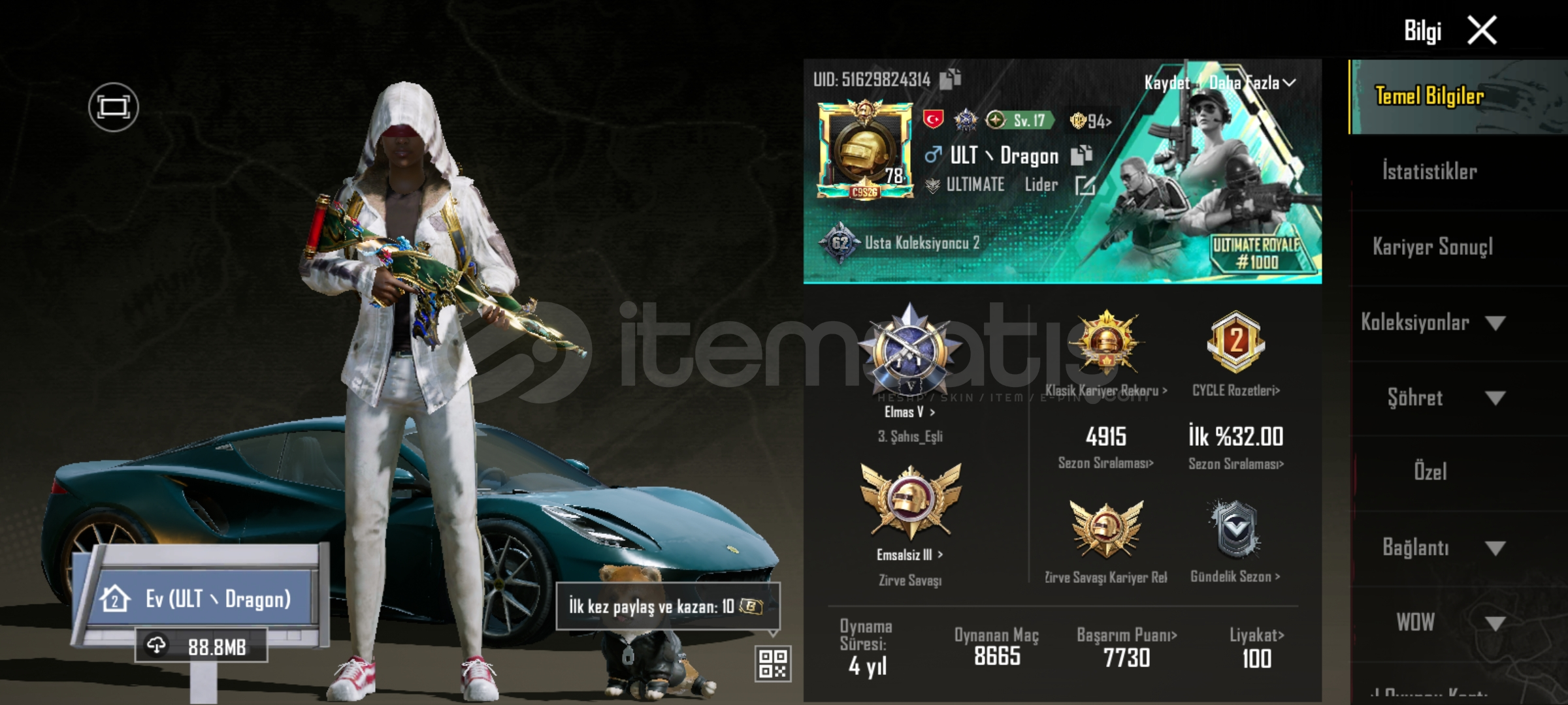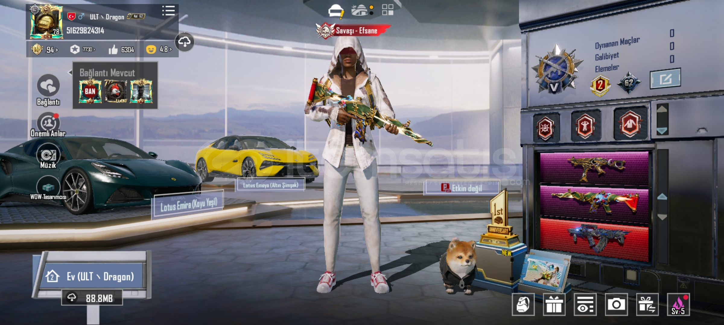 Hesap 4 yıllık 78 seviye 62 koleksiyon2 kere Fatih 1 kerede Efsane oldu şuan emsalsiz 3 sıra 750 de2 tane Lotus Spor araba var Yalan kükreme M4 6 seviyeUmp, AKM, M7, uzi gibi 10 silahta ölüm mesajı var fiyatta pazarlık yapılır ciddi alıcılar yazsın