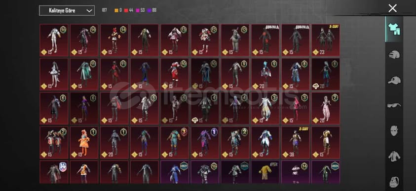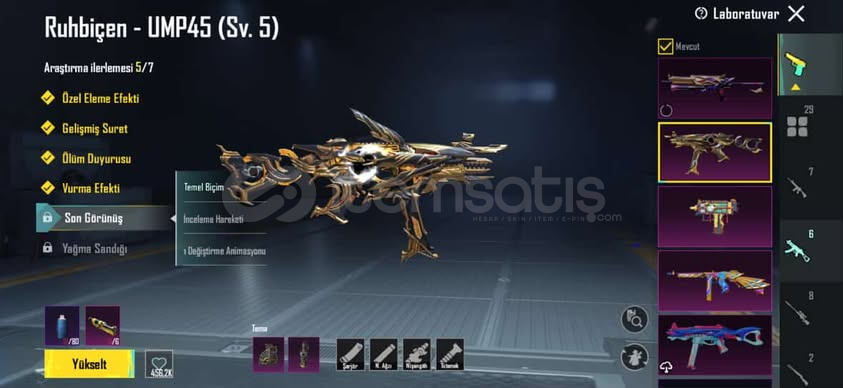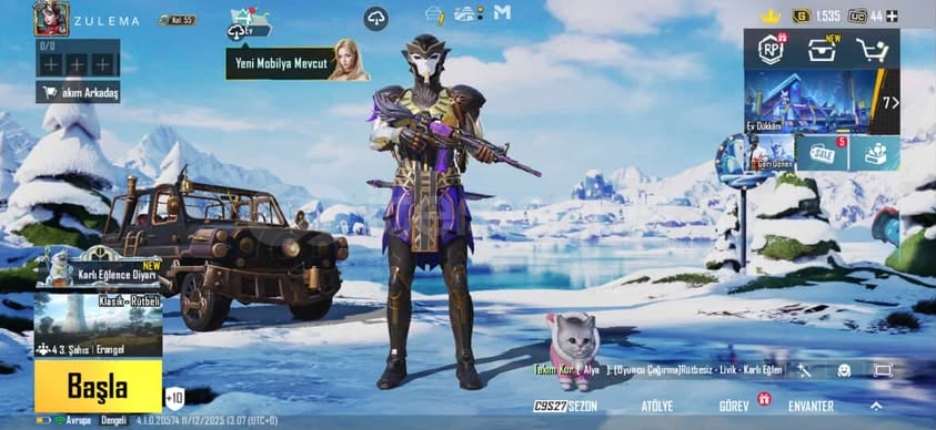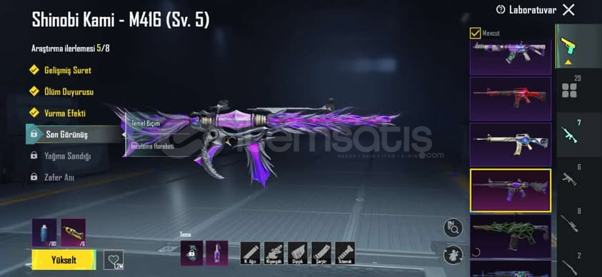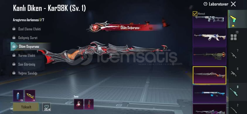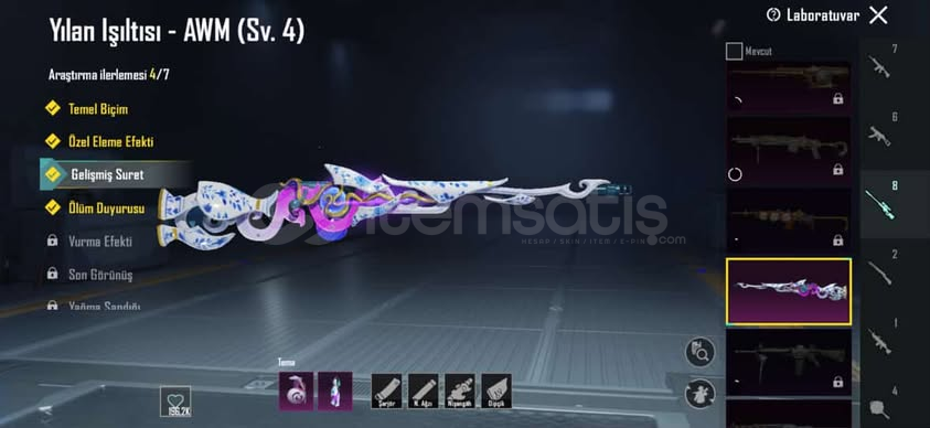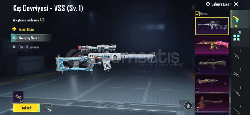 Öne çıkan silahlar (laboratuvar/yükseltilebilir):AWM — Yılan Işıltısı (Lv.4)M416 — Shinobi Kami (Lv.5)UMP45 — Rubiçen (Lv.5)Kar98 — Kanlı Diken (Lv.1)VSS — Kış Devriyesi (Lv.1)Toplam yükseltilebilir silah: ~21 adetNadir içerikler & koleksiyon:X-Suit: Firavun (2sv), Anukkra (2sv)Kıyafet: 187+ parçaŞapka: 122+ parçaÜst giyim: 72+ parçaAlt giyim: 42+ par...