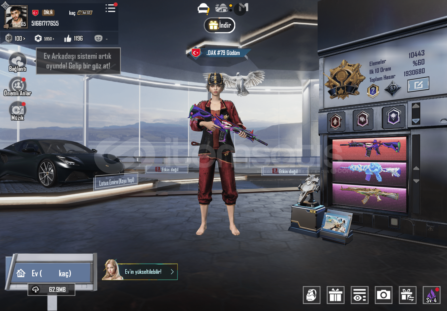 selamın aleyküm arkadaşlar öncelikle hesabı son sınıf olduğum için ders yapmam gerektiğinden ve kitap alıcak paraya ihtiyacım olduğundan satıyorum.hesap görsellerde gözüktüğü gibidir ayrıca destansı gösteriş ünvanıda vardır. geçtiğimiz sezonlarda 3 sezon üst üste elit pass açılmıştır.hesabımda sadece telefon...