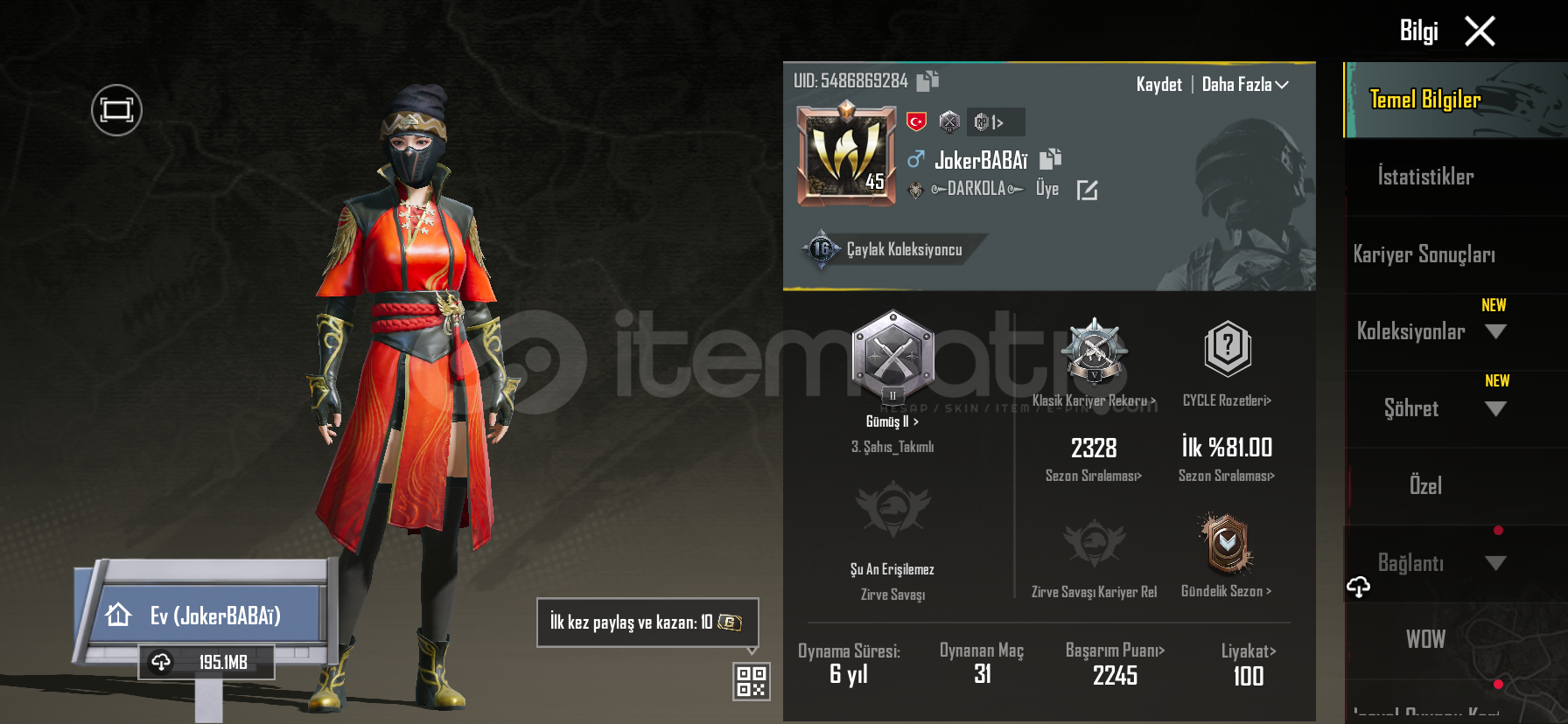 MERHABALARHESAP 45 SEVİYEİÇİNDEKİLERSOKAK SANATÇISI BERE VE MASKESİ MEVCUTDESTANSI ETEK VAR10-11 E YAKIN SİLAH DESENŞ MEVCUTDETAYLAR FOTOĞRAFTA VARHESABA ALT MAİL İLE GİRİŞ YAPILIYOR7.SEZON HESABIDIRBAŞLANGIÇ İÇİN İYİ HESAP
