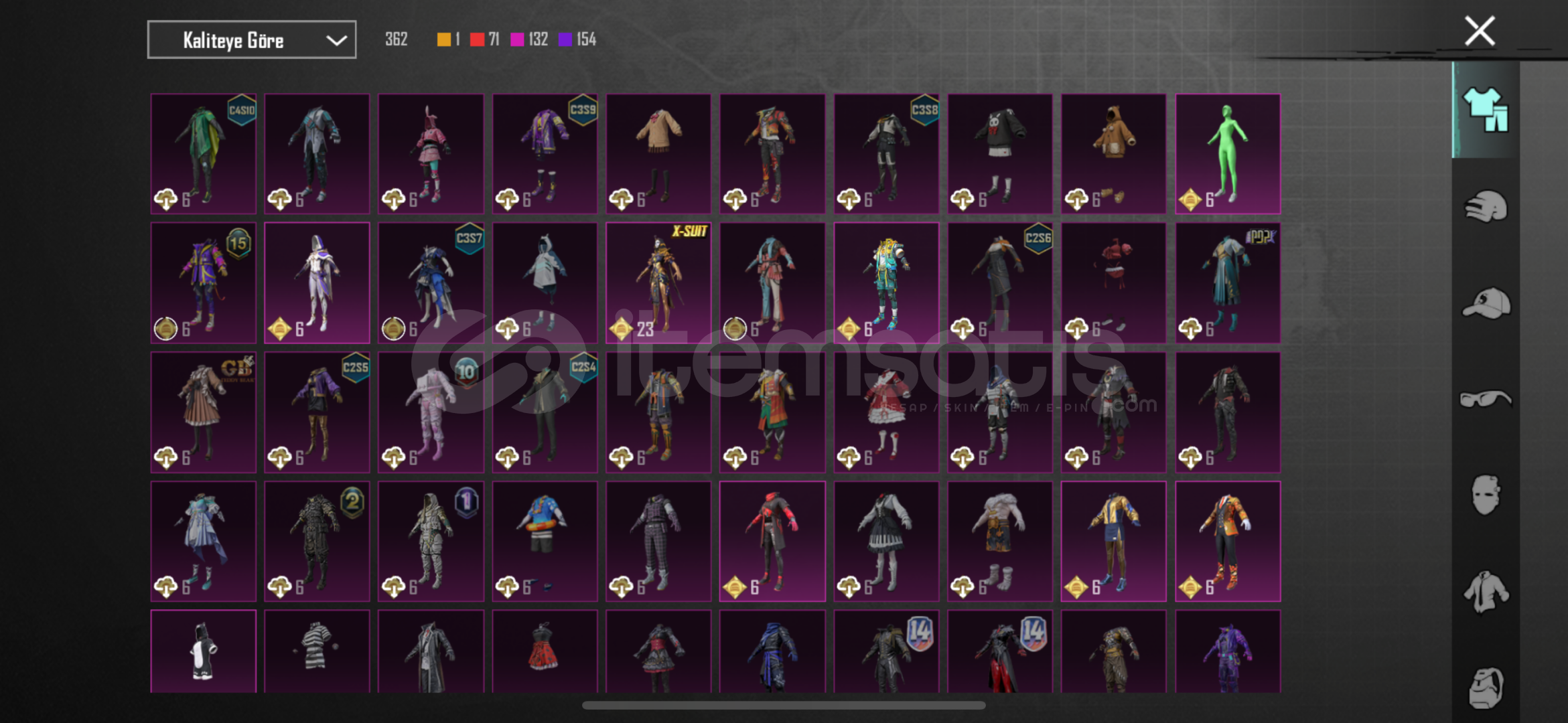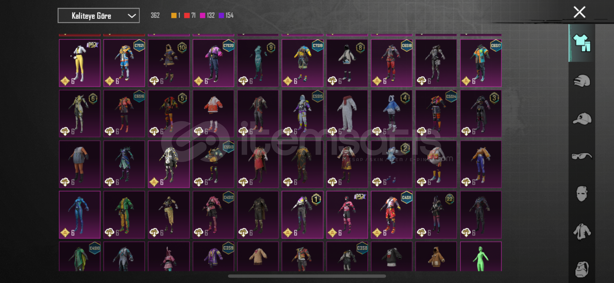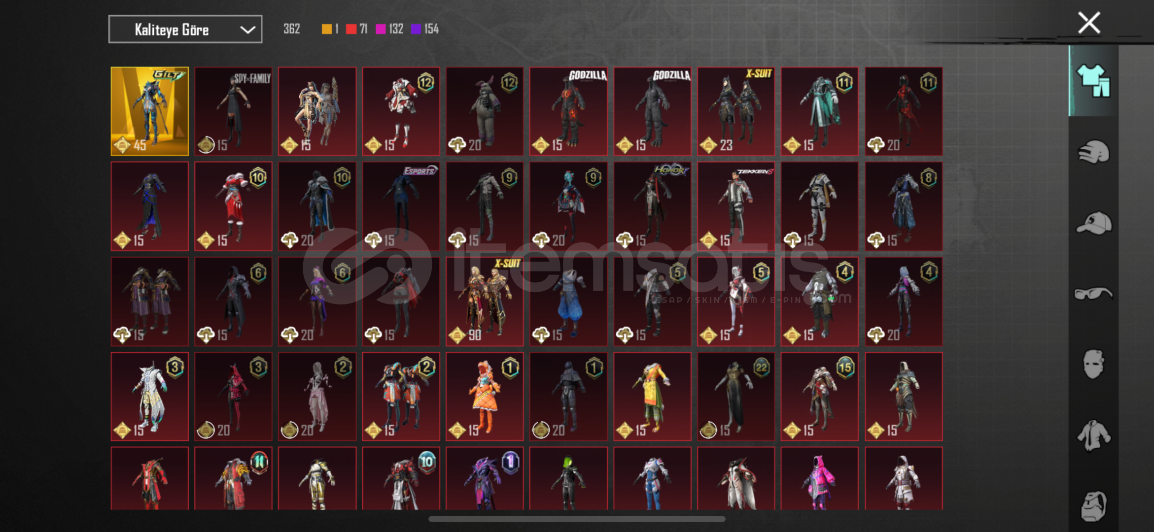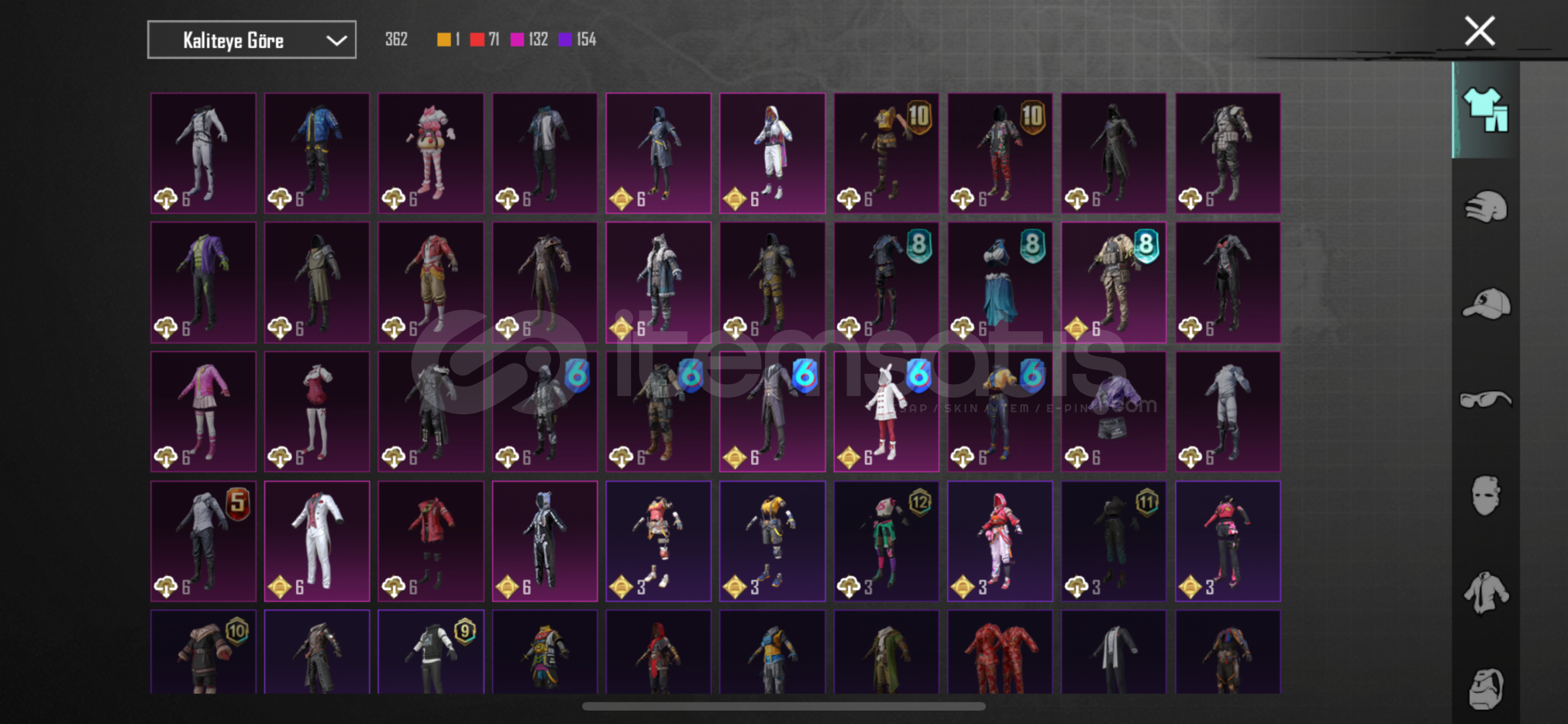 -78 seviye-6920 başarım puanı3 adet X suit Kor alev Zırhı 5.seviye47 adet yükseltilebilir silah deseniBuz 7Maskara 7Kertenkele 7Muhteşem hisar scar fullKatil Balkabağı 4Küçük midilli 4Buz diyarı Ak 4Altın pençe p90 4Ruhani muhafız uzi fullDenizlerin evrimi ump fullEmp-ump 4Vahşet uzi 4Şirin kedi kar98 fullMor intikam awm 4Rock gecesi kar98 4Lider panter dbs fullAlevli godzilla savaş baltası fu...