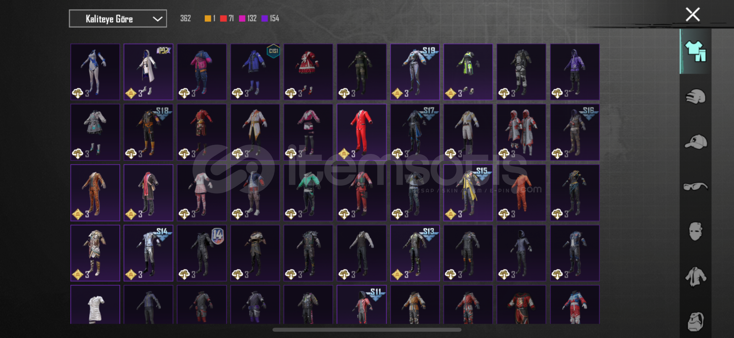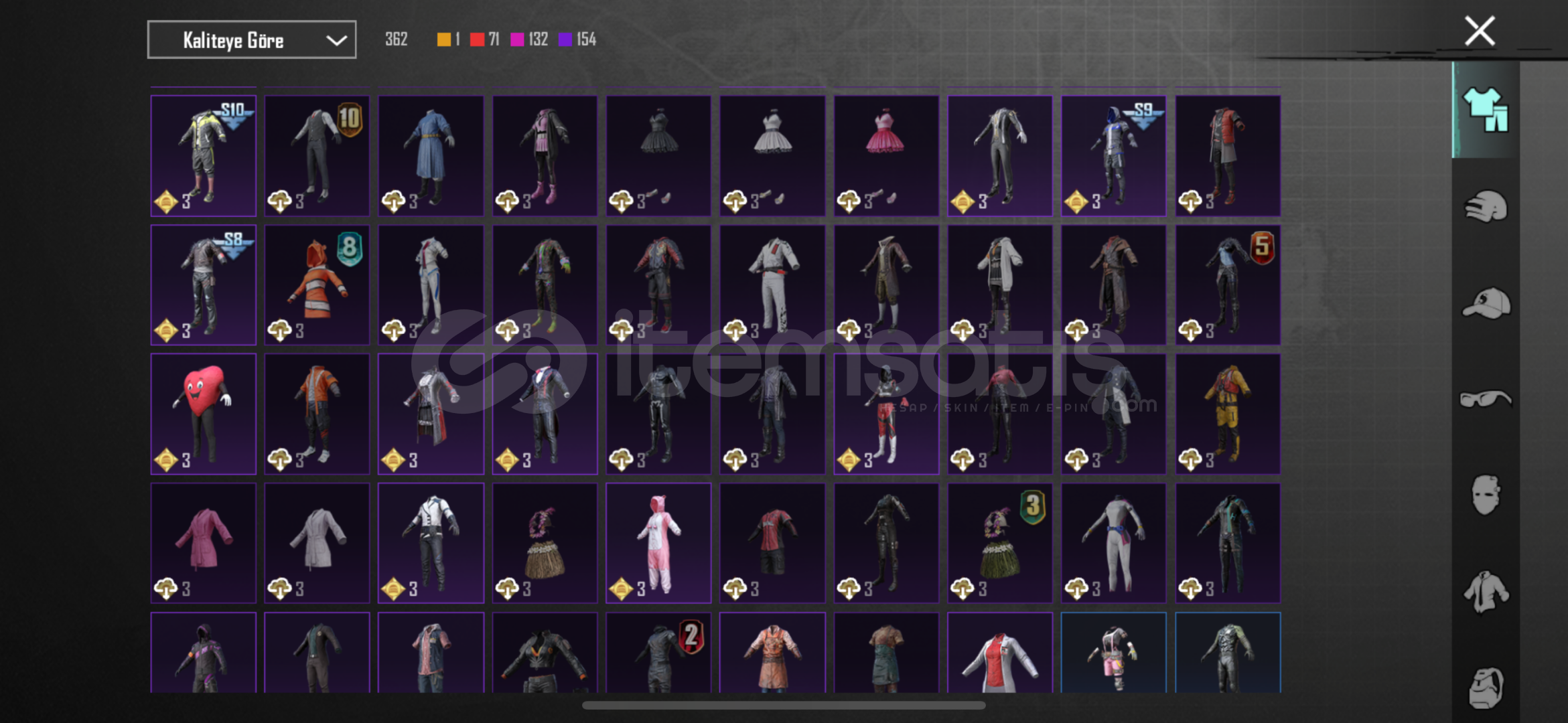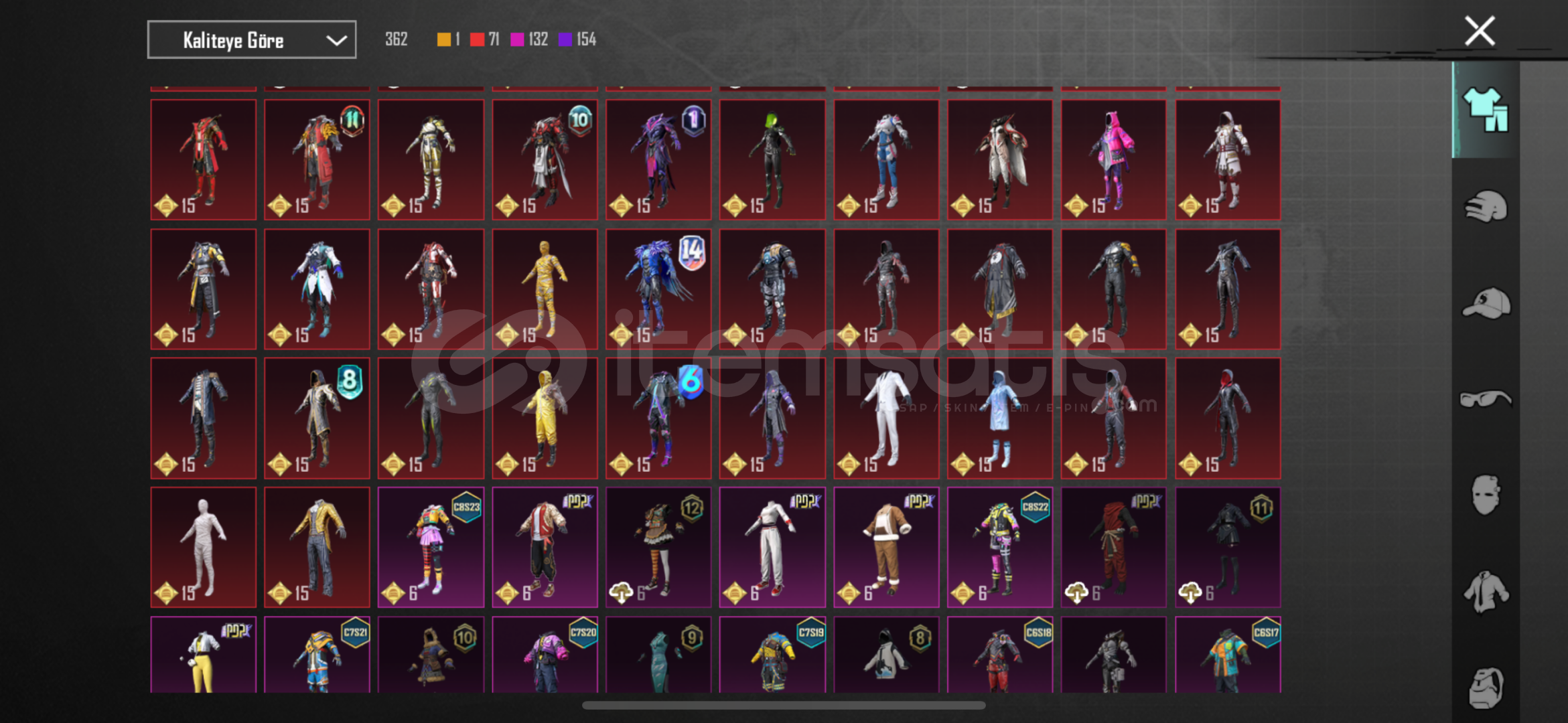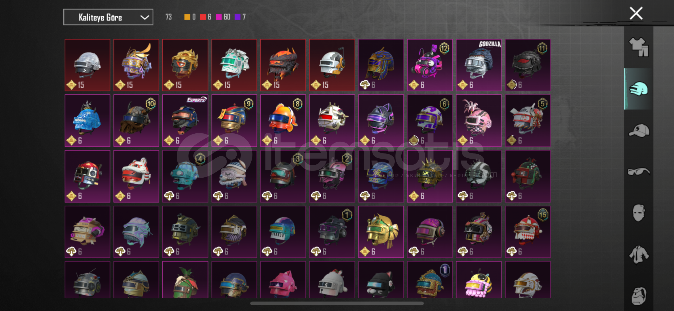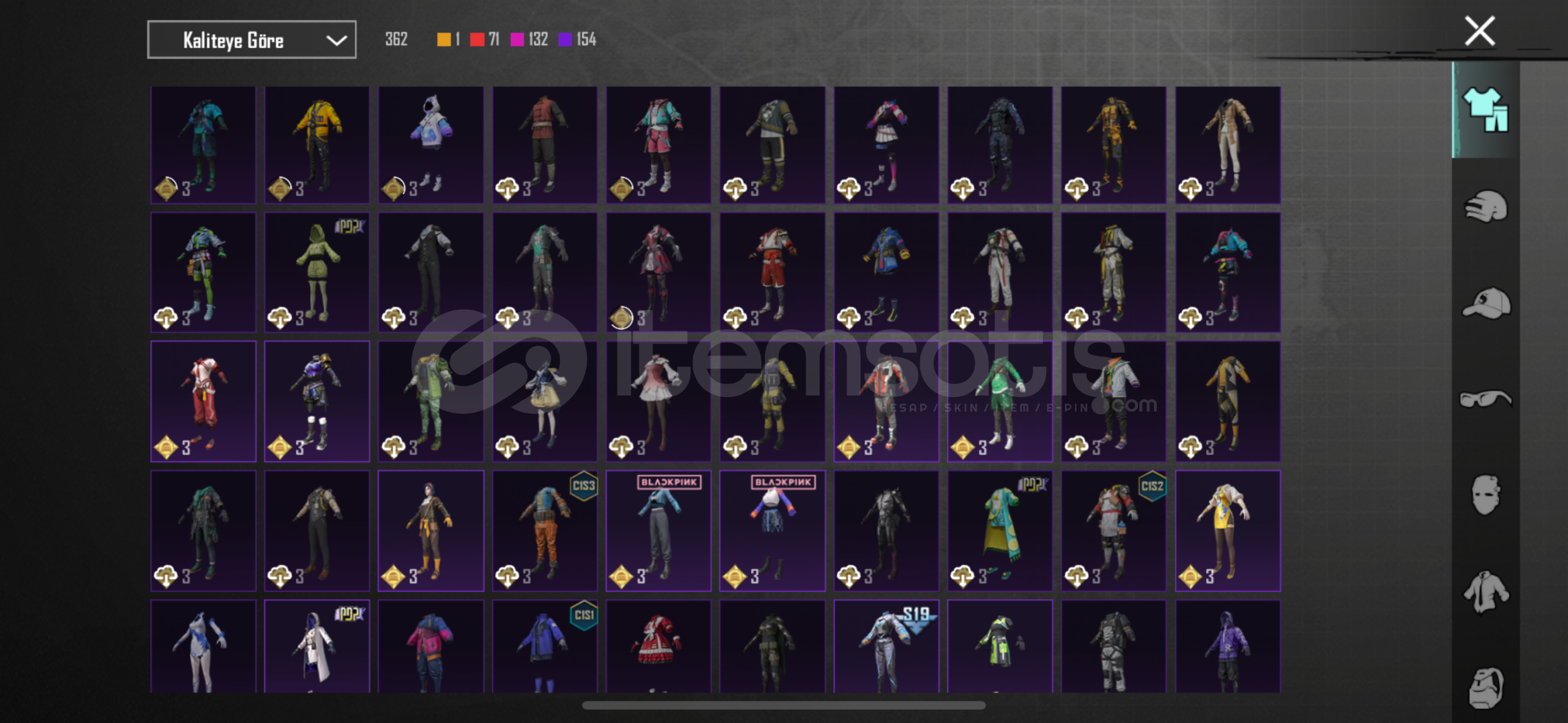 -78 seviye-6920 başarım puanı3 adet X suit Kor alev Zırhı 5.seviye47 adet yükseltilebilir silah deseniBuz 7Maskara 7Kertenkele 7Muhteşem hisar scar fullKatil Balkabağı 4Küçük midilli 4Buz diyarı Ak 4Altın pençe p90 4Ruhani muhafız uzi fullDenizlerin evrimi ump fullEmp-ump 4Vahşet uzi 4Şirin kedi kar98 fullMor intikam awm 4Rock gecesi kar98 4Lider panter dbs fullAlevli godzilla savaş baltası fu...