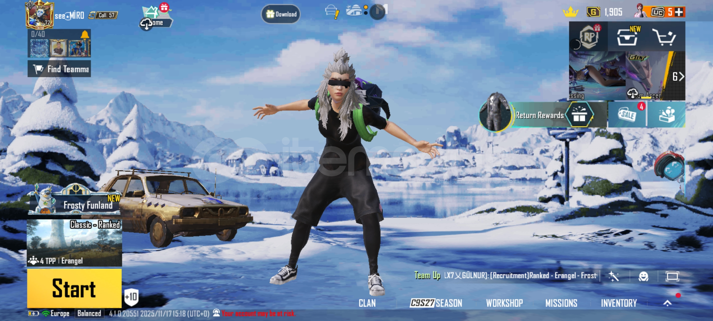Hesapta 7 seviye klan da vardır.Eski set olan formalar gibi çok fazla eskisezon kostümler bulunur.Buz diyarı seti vardır.Hesap fatih olmuştur80 Destansı bulunur ve 1 Nihai (Gümüş gurunun maskesi) Bulunur.15 Yükseltilir silah vardır vem24, ump, m7 ve birkaçının ölüm duyurusu vardır.Hesabın form geçmişi yok, Tertemiz al kullan hesap.Tel no ve Gmail değişir.