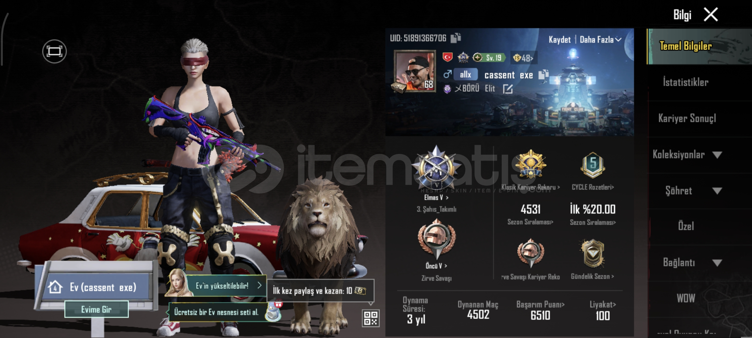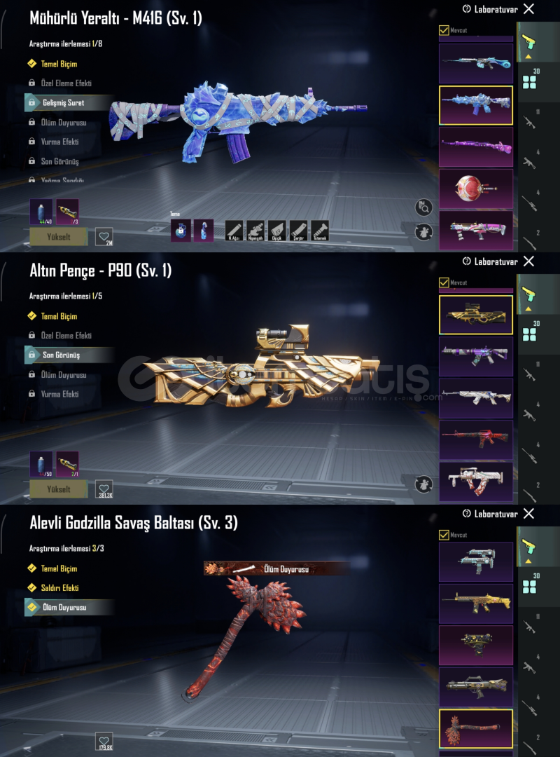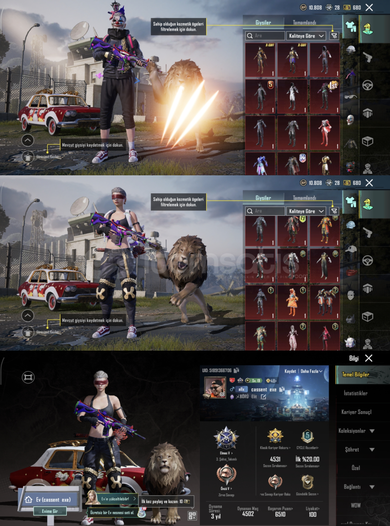 Hesap 82 destansidir İçinde 30 yükseltilebilir silah mevcuttur ;Yıl dönümü Ump 7 lvMaskara M4 6 lvYedi Denizler m24 4 lvKüçük midilli M7 4 lvGöksel işaret uzi 4 lvGecenin Şarkısı groza 5 lvEjder katili yadigari pala 3 lvDenizlerin evrimi Ump 3 lvLider panter DBS 3 lvPeri Cazibesi tava 3 lvŞirin kedi kar98 3 lvAlevli Godzilla baltası pala 3 lvMumya uzi 2 lvMumya M4 1 lvMaskara scarl 1 lvAşk konçer...