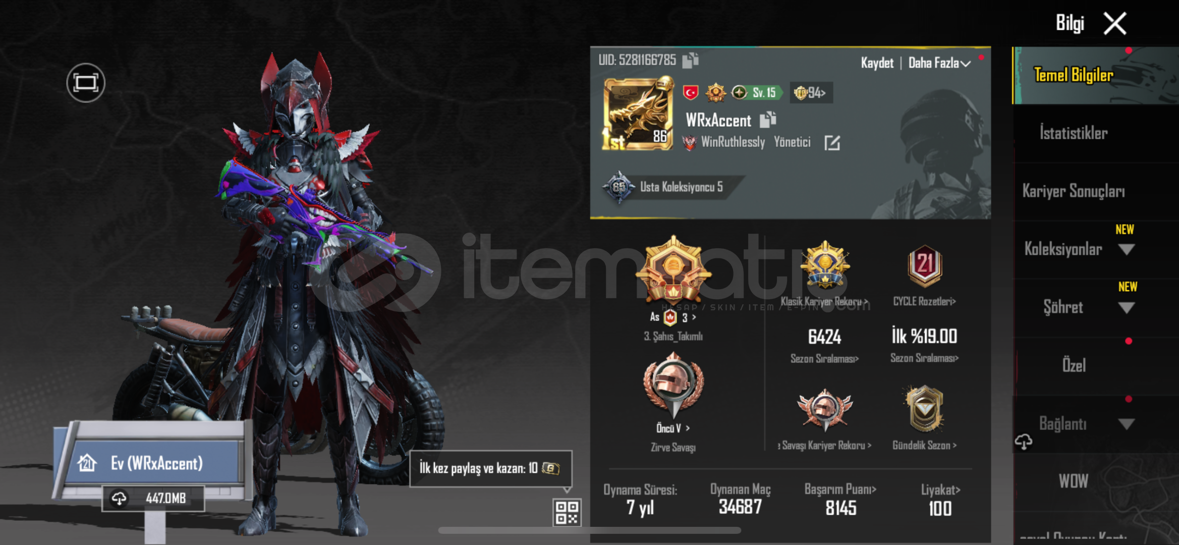 ID:5281166785Hesap seviyesi 86 Koleksiyon seviyesi 65110 Destansı—DESTANSI SETLER—Kanlı kuzgun zırhx 4lvlKara köpek balığı dalgıç kıyafetiVampir setiMetal fırtına setiAltın zarafet setiAmansız suikastçı setiNut savaşçısı setiNeon lord setiKara şahin setiGece kuşu setiDestansı carlo seti—NADİR ÖĞELER—Darly DixonKorsan üstüThe Wal...