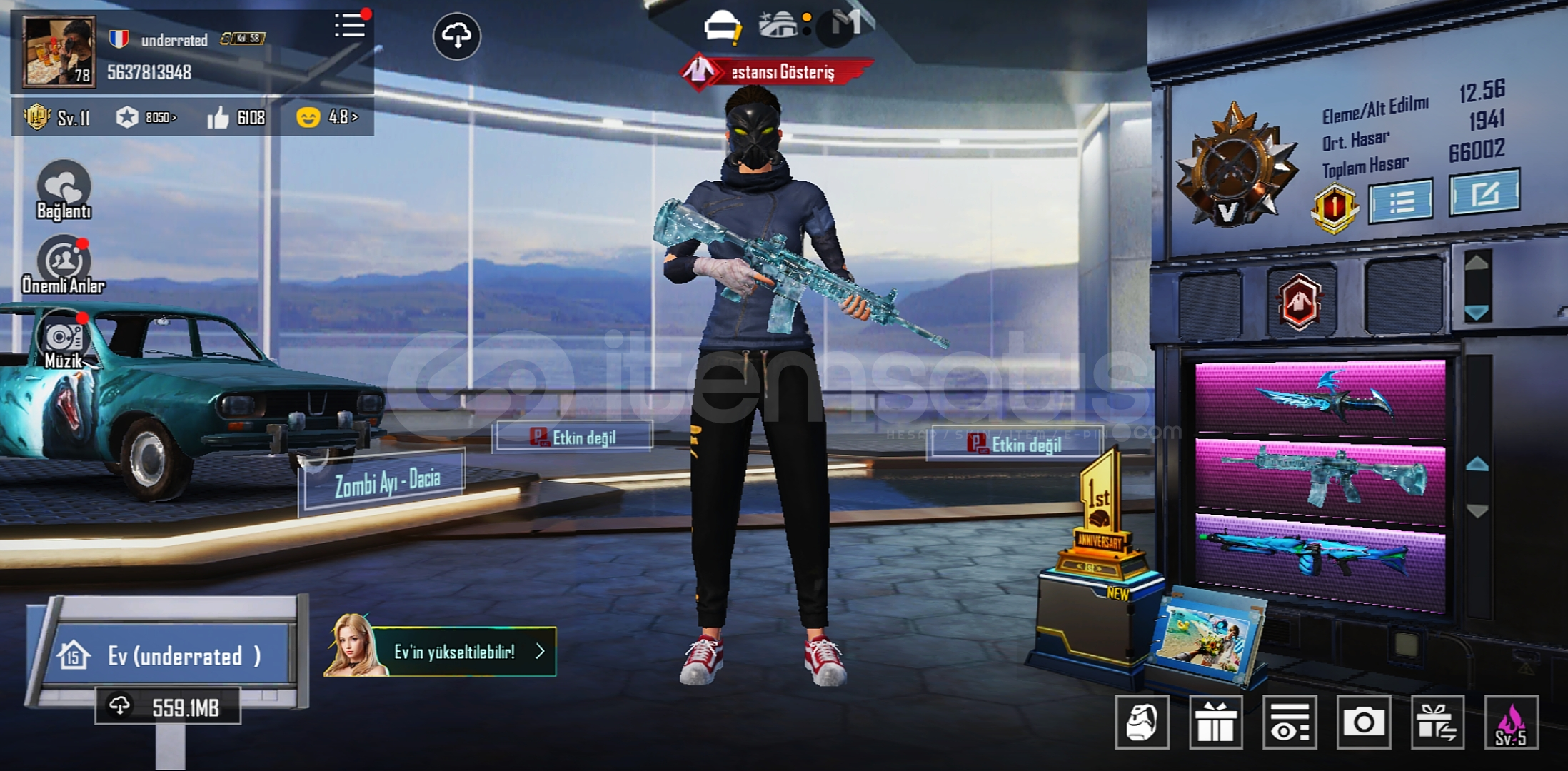 87 destansılı 78 seviye 7 yıllık pubg mobilr hesabı . İçerisinde 4 tane özel emojili mythic seti mevcut. 20 tane yükseltilebilir silah. Buz m4 6 svy mg 4 svy ve daha fazlası . Silahlardan 5 tanesi ölüm duyuruludur. Daha fazla detay için dm
