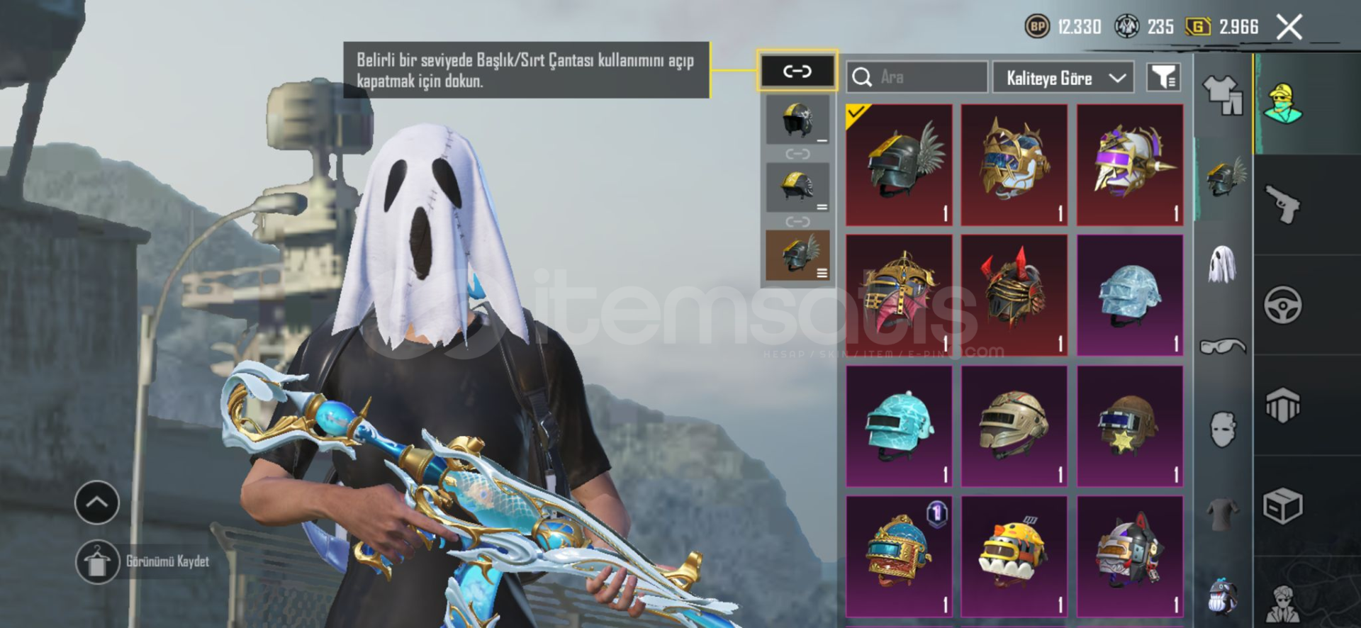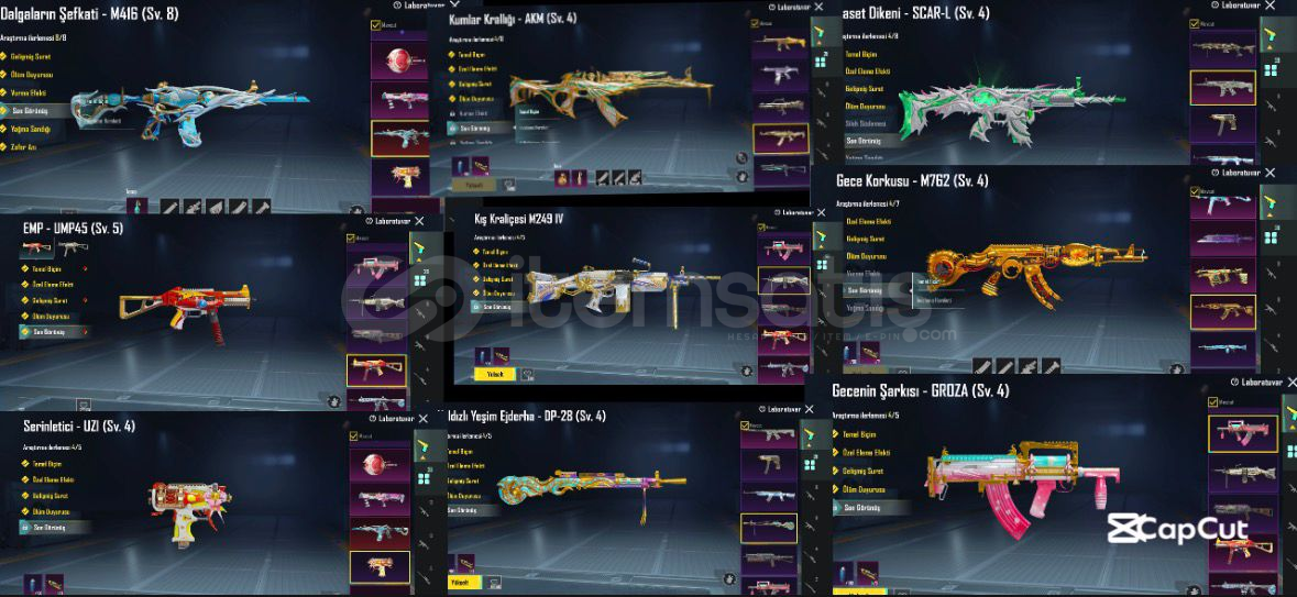 76 DESTANSIHİÇLİĞİN CAZİBESİ ZIRH-X - 5 YILDIZLI!!! 27 YÜKSELTİLEBİLİR !!!!!! 13 ÖLÜM DUYURUSU !!!DALGALARIN ŞEFKATİ M416 - 8 SEVİYE (BÜTÜN EKLENTİLER AÇIKTIR)KUMLAR KRALLIĞI AKM - 4 SEVİYEGECE KORKUSU M762 - 4 SEVİYEHASET DİKENİ SCAR-L - 4 SEVİYEPLATİN TÖRPÜ UMP45 - 5 SEVİYESERİNLETİCİ UZİ - 4 SEVİYEYALDIZLI YEŞ&#...