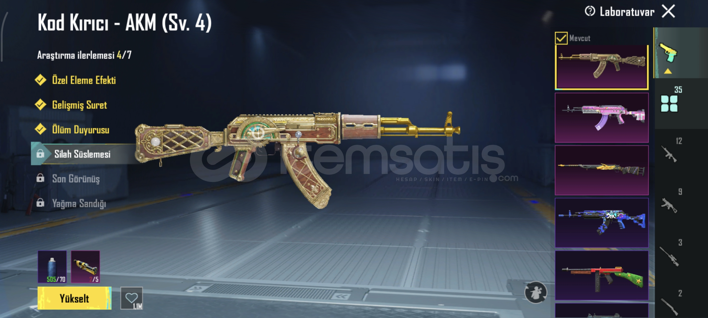 97 DESTANSI36 Tane Yükseltilebilir SilahYakan Kükreme M4 (5 seviye)Cehennem Çığlığı AUG (4 seviye)Ruh Biçen UMP (3 seviye)Kod Kırıcı AKM (4 seviye)Aşk Konçertosu M7 (4 seviye)Küçük Midili M7 (3 Seviye)2 TANE X-SUITFİRAVUN (2 Seviye)ANUKHRA (1 SEVİYE)ÖNEMLİ ÖGELERDalgıç SetiBuz Diyarı Setiİşgalci SetiNut Savaşçısı SetiMaskeli Medyum...