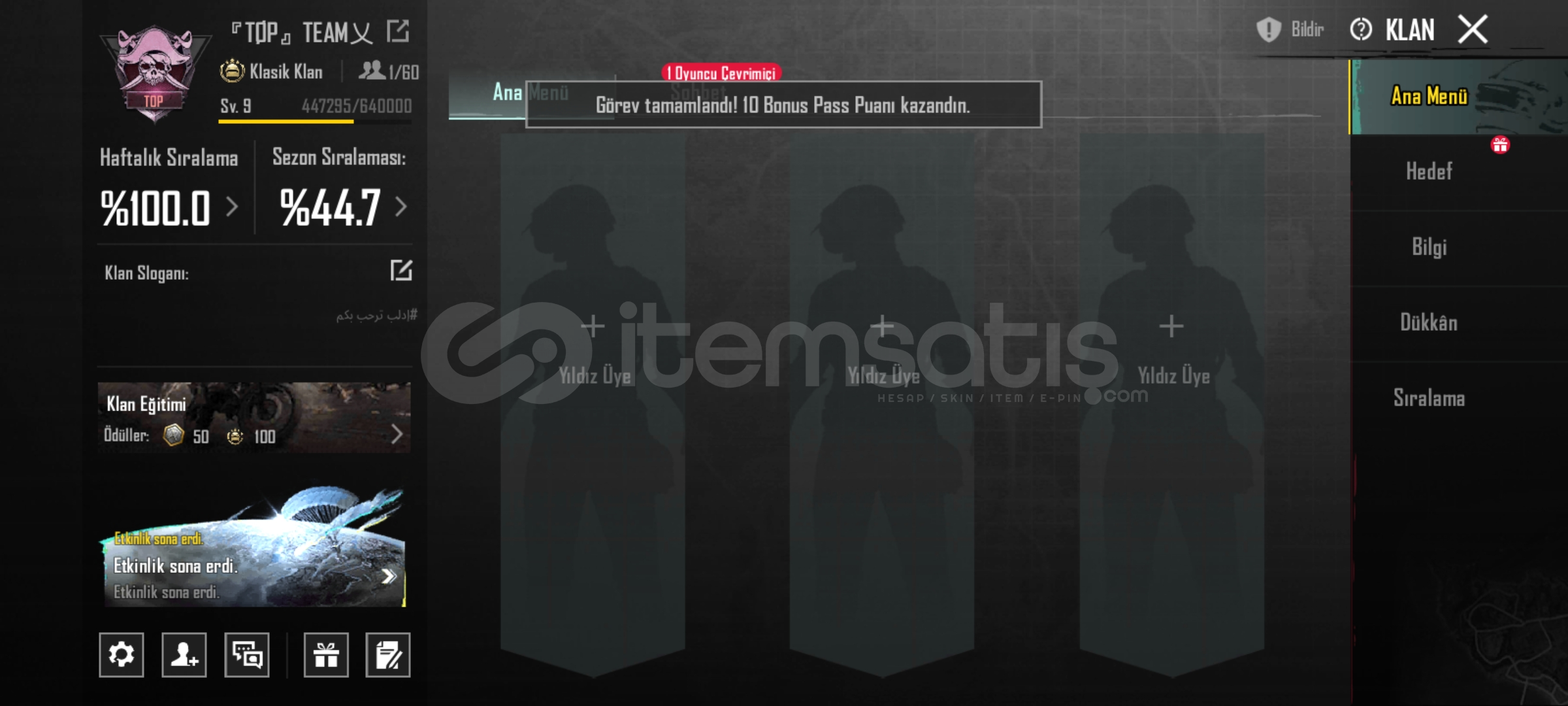 9.7 LEVEL KLAN İSİM DEĞİŞİM AKTİFTİR 2 İLA 5 DK İÇİNDE TESLİMAT YAPİLACAKTİR SİTEDE AKTİF OLMASAM BİLE ALABİLİRSİNİZ ANLİK SMS GELİYOR SATILDIĞINA DAİR HEMEN SİTEYE GELİP DEVİR YAPIYORUM İD ATMANİZ YETERLİDİR
