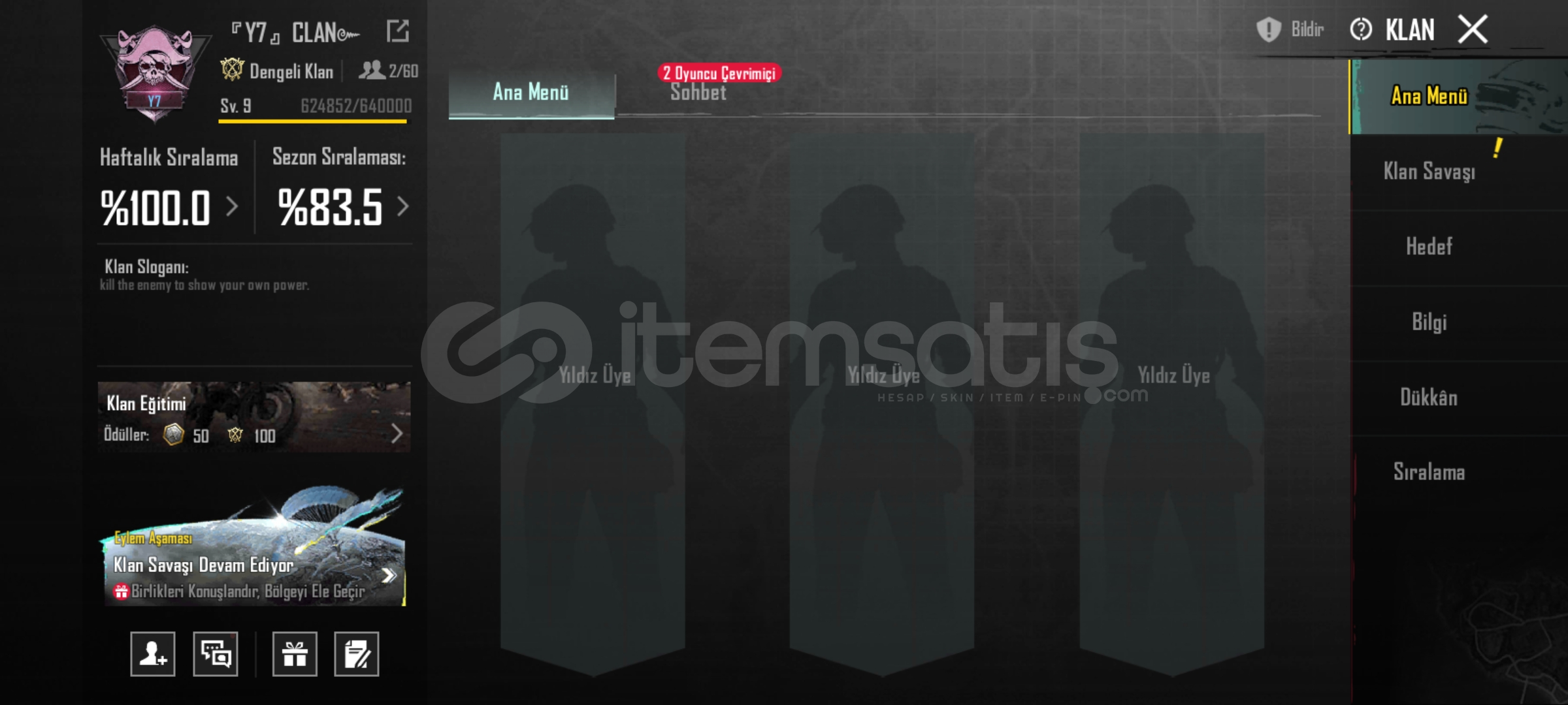 9.9 LEVEL KLAN İSİM DEĞİŞİM AKTİFTİR 2 İLA 5 DK İÇİNDE TESLİMAT YAPİLACAKTİR SİTEDE AKTİF OLMASAM BİLE ALABİLİRSİNİZ ANLİK SMS GELİYOR SATILDIĞINA DAİR HEMEN SİTEYE GELİP DEVİR YAPIYORUM