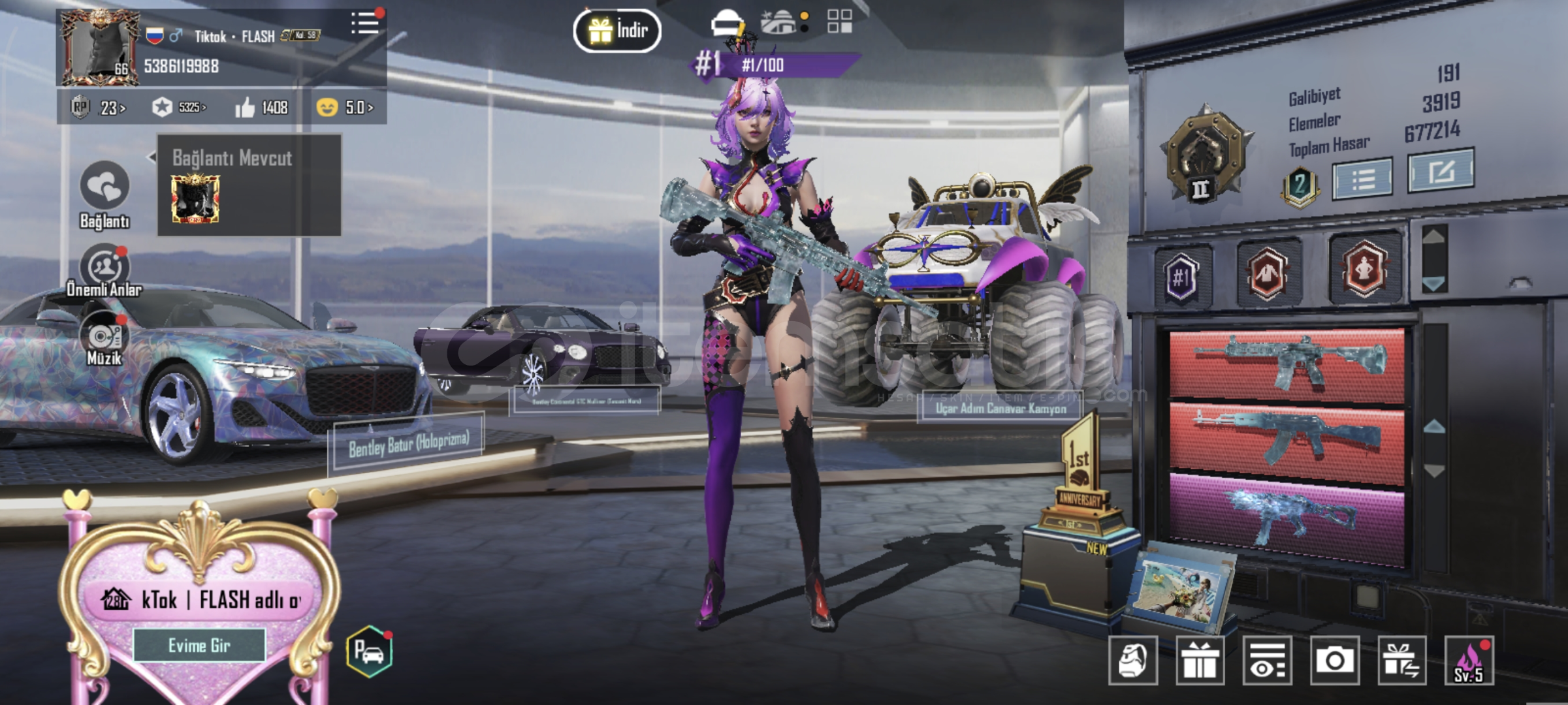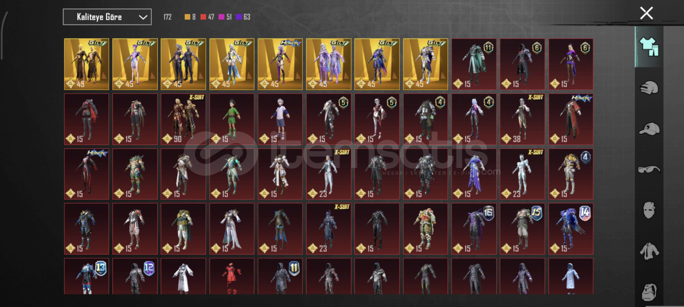 Hesapta toplam 8 adet Nihai set bulunmaktadır.En nadir ve en değerli set Tekinsiz Soytarı’dır.4–5 adet X-Suite mevcuttur.Bunlardan 1 tanesi kill efektlidir.Toplam 18 adet silah vardır.8–9 tanesinde kill message özelliği bulunur.2 adet MAX seviye silah vardır.1 adet 6 seviye silah, birkaç adet 5 ve 4 seviye silah mevcuttur.Diğer silahlar 1. seviyededir.2 adet spor araba bulunmaktadır.1 tanesi 3 kartlı, 1 tanesi 1 kart...
