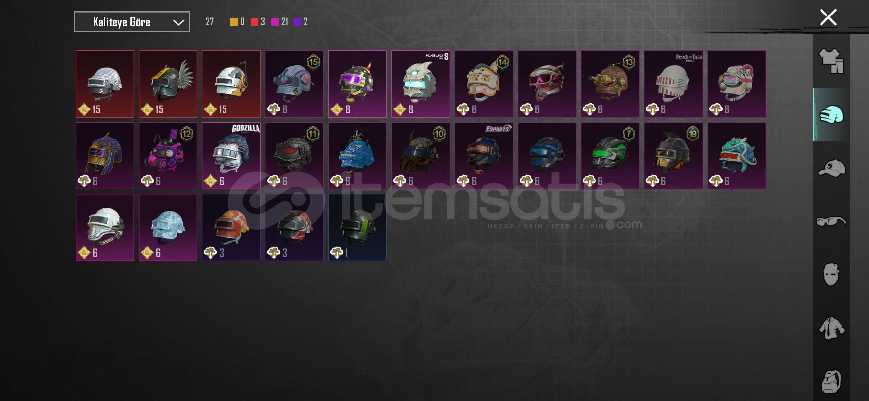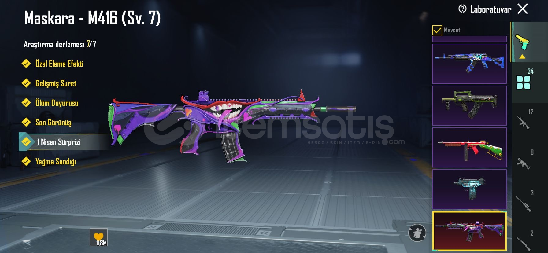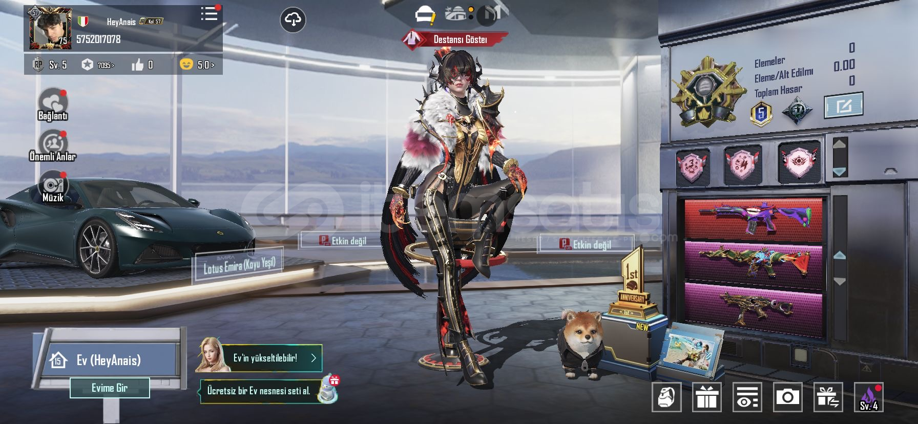 Maskara - Max svMühürlü yerlaltı - m416 5 sv Yakan kükreme m4 - 6 seviye Ruhbiçen ump - 4 seviyeZihirli cehennem uzi - 4 svAltın pençe P90 - 4 seviyeGece gladyötörü bizon - 4 seviye Şekerli baston thampson - 4 seviye Bitlik ump - 4 seviyeKüçük Midilli m762 - 4 seviyeKahramanlık ağıdı - AWM 1 sv2 tane lotus spor araba S5 saçı varKadın Firavun 1svAnukhra 2s...