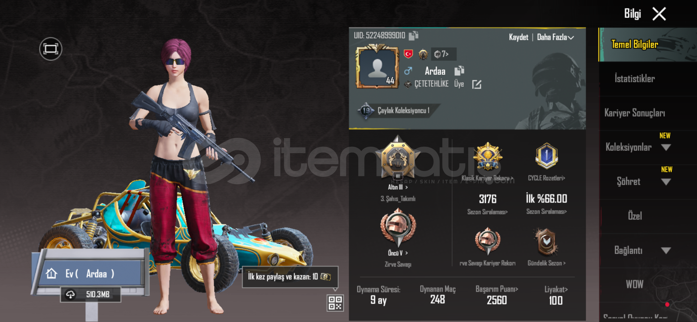 2 tane isim değiştirme kartı falan var oda kartları falan dolu hesapda çanta kask sandıktan cıkarttım hesaba uc yüklemedim hiç paraya ihtiyacım var FOTOĞRAFLARDA DA VAR SADECE TWİTTER HESABI VAR BAĞ OLARAK KESİNLİKLE E POSTA YADA TELEFON NUMARASI YOKTUR Hesap as otoritesine kadar çıkmıştır avrupa hesabıdır