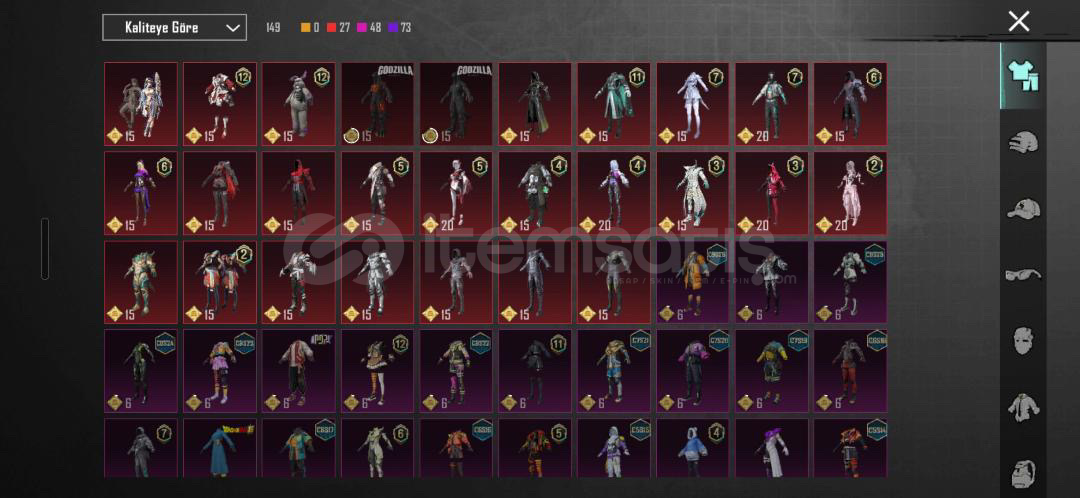 Toplam 149+ setBirçok efsanevi (legendary) ve mitik (mythic) kostümGodzilla setleri dahil birçok özel işbirliği kostümüNadide, sezonlara özel ve artık gelmeyen birçok outfit mevcutHesap temizdir, ban riski yokturGmail/FB/Telefon hangi bağlama sahipse devri tertemiz yapılacaktırÖne Çıkan Kostümler:Godzilla SetleriMitik kıyafetler (toplam sayıyı yazabilirsin)Efsanevi maskotlar, kombinle...