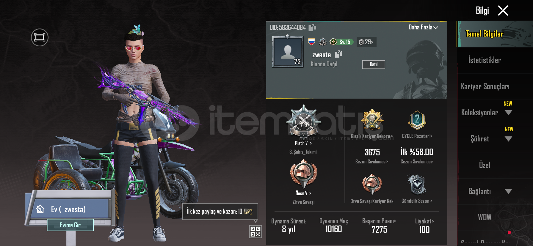 Hesap seviyesi : 73Destansi sayi : 65Yukseltilir sayi : 19ANUKHRA ZIRH-X - 1 SEVİYE + 74 YILDIZ PARÇACIĞIFİRAVUN ZIRH-X - 2 SEVİYE + 74 YILDIZ PARÇACIĞISOYTARI SETİBÜTÜN SAÇLAR AÇIKTIR YÜZ BİLE VAR DAHA NE OLSUNSERİ KATİL SETİBÜUÜLEYİCİ REN GEYİĞİ SETİİŞGALCİ SETİÇELİK ASKER KOSTÜMÜAMANSIZ SUİKASTÇI SETİNUT...