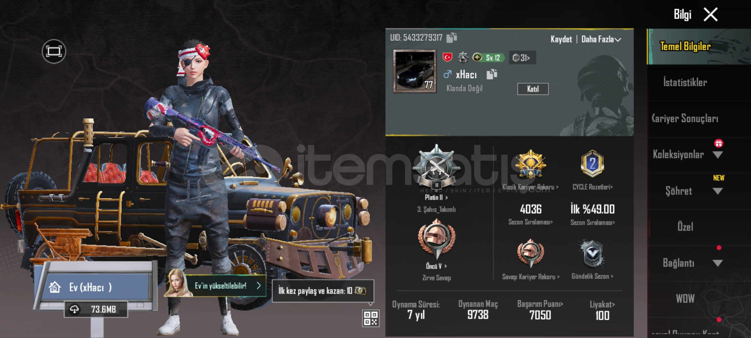 öncelikle selamlar arkadaşlar hesaba kefilim mükemmel hesaptır fiyatını hak eden bir hesaptır asla geri çekilme ban veya şüpheli bir durum olmayacaktır