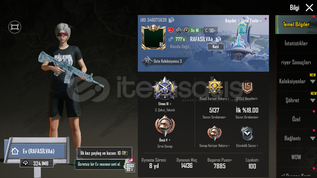 Hesabın 63 koleksıyon 104 destansı 8 yıllık 18 yükseltilebilir 6 tane ölüm duyurusu olup bir çok kombinlik kıyafetler vardır pazarlık payı vardır alım sonrası sorumluluk sıze aıtdir sımdıdıden alana hayırlı olsun  Buz 6Darly dixonButcher seti S2 korucu giysisi Rock yıldızı setiGöz bandı CrewMavi şortSiyah sort The walk...