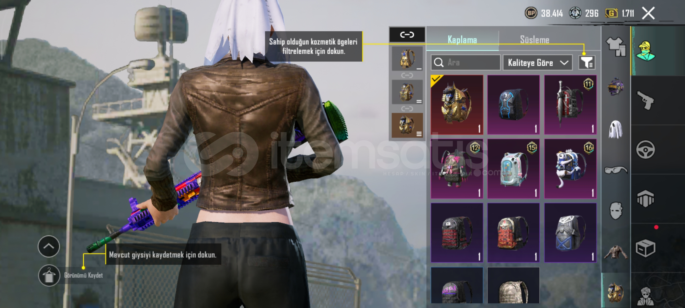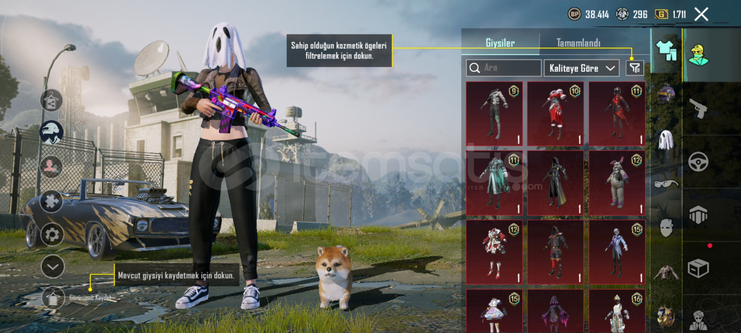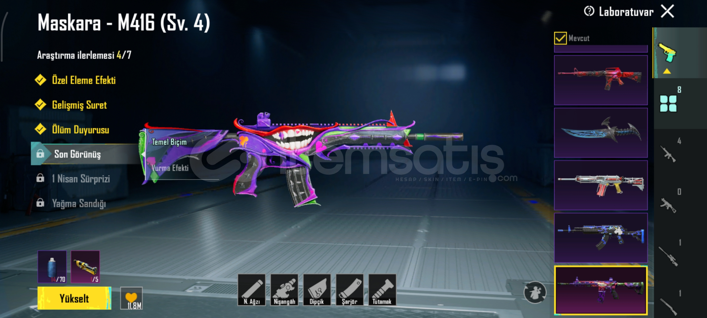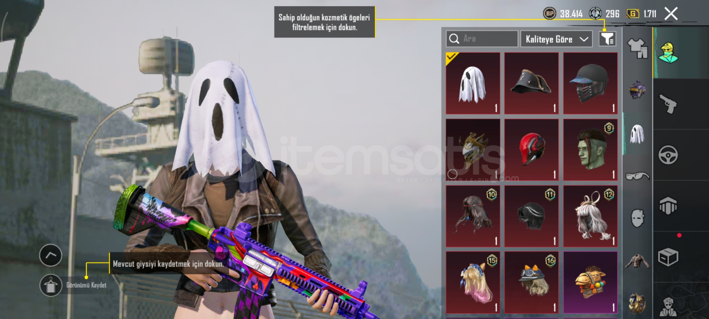Maskara m416 (4sv)Firavun çantasıBağlar temizGoogle direk devir edilicekZırhlı avcı mirado2 adet amblem1.5 mataryelS4 saç ilk olanGöz bandıFiyat SONDUR