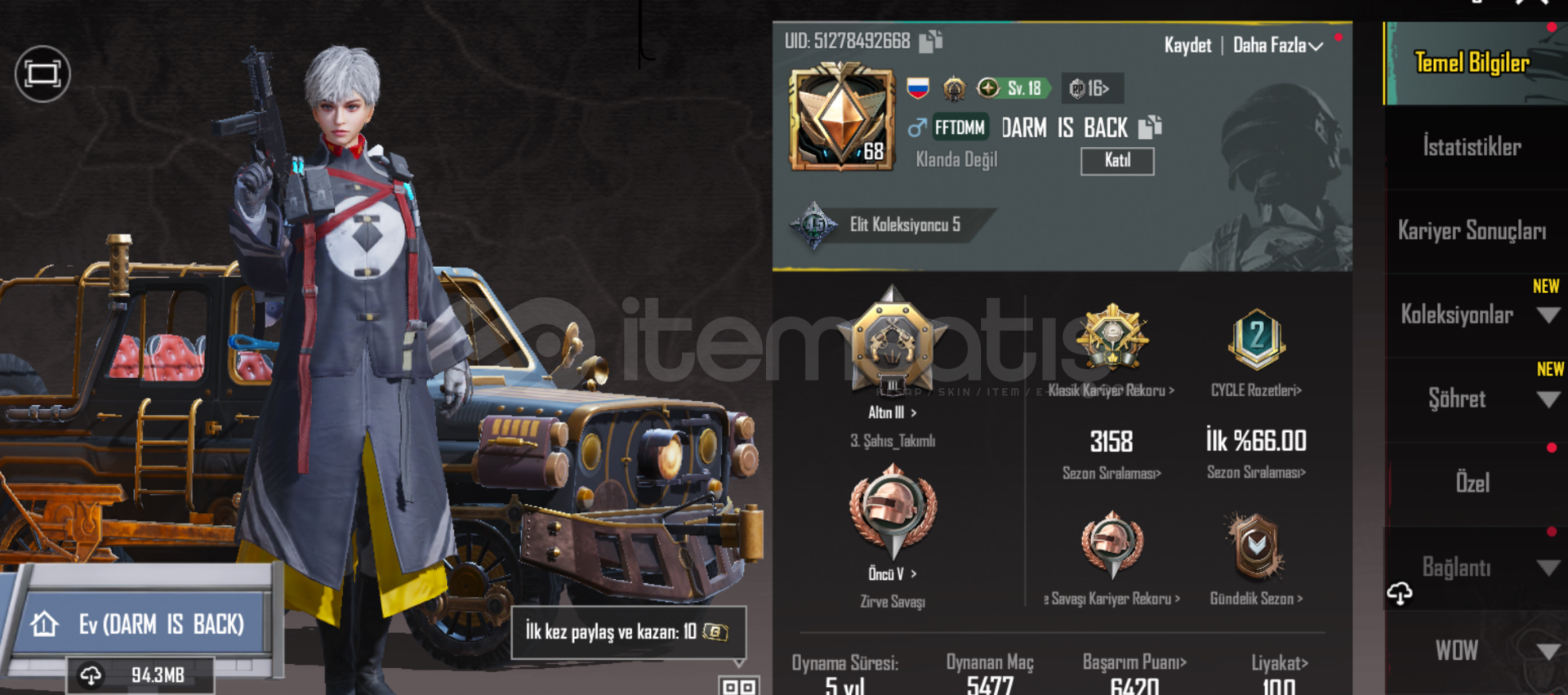 45 koleksıyon27 destansı 1 nahai çanta8 tane yükseltilebilen silahyıl dönümü ump buz diyari 3 seviyedeniz savaşçısı 4 seviye (dp28)gece koncası 1 seviye (AUG)hesapın id 51278492668
