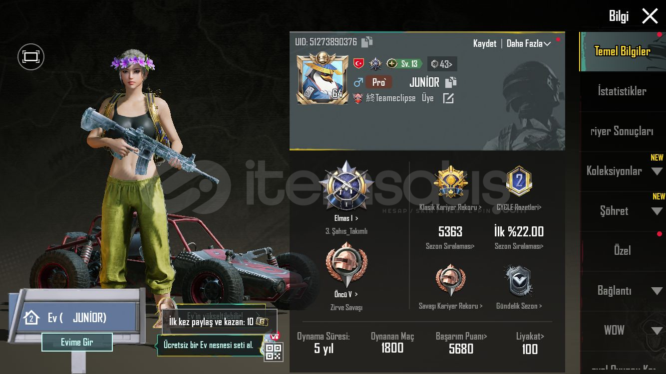 66 SEVİYE 15 DESTANSI39 KOLEKSİYON4 ROYAL PASS AÇILMIŞ 6 YÜKSELTİLEBİLİR SİLAH5 DESTANSI AMBLEMFİRAVUN ÇANTASI VE PARAŞÜTÜ VARDIRGÜZEL TDM KOMBİNLERİ VARDIRID KARTI VARDIR (20 GÜNLÜK)5 SENELİK ŞAHSİ HESABIMDIR DETAYLAR İÇİN DM GELEBİLİRSİNİZ PAZARLIK VARDIR ID:51273890376ALANA HAYIRLI OLSUN Herhangi bir sorun yaşamazsınız büt&u...
