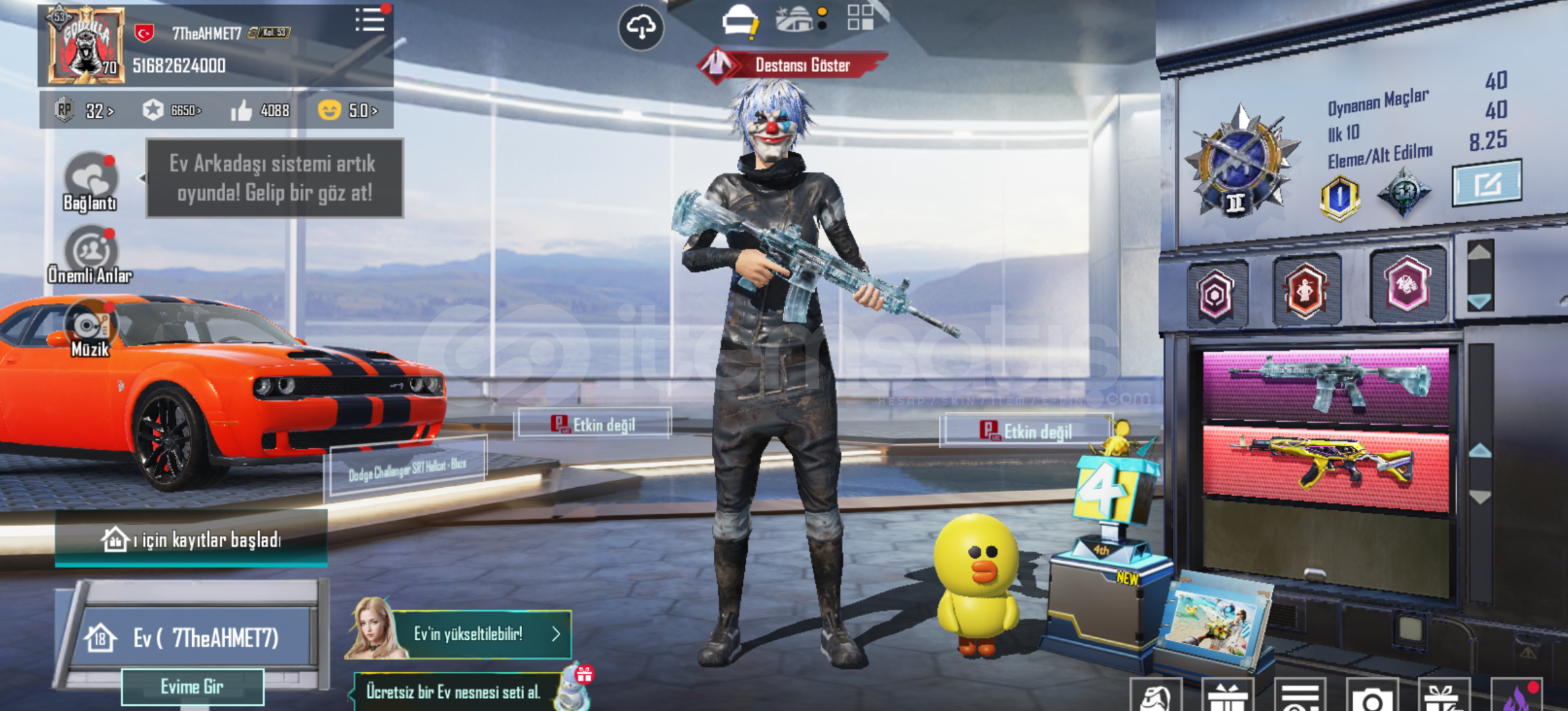 22 tane geliştirebilir silah59 tane destansı1 nahaiÇIĞ ZIRH-X 2 SEVİYEGİZEMLİ SOYTARI ZIRH-X ( 1seviye)buz diyari 5 seviye hesap bomba gibiBİR TANE SPOR ARABA 3 tane pet var hesapın id: 51682624000