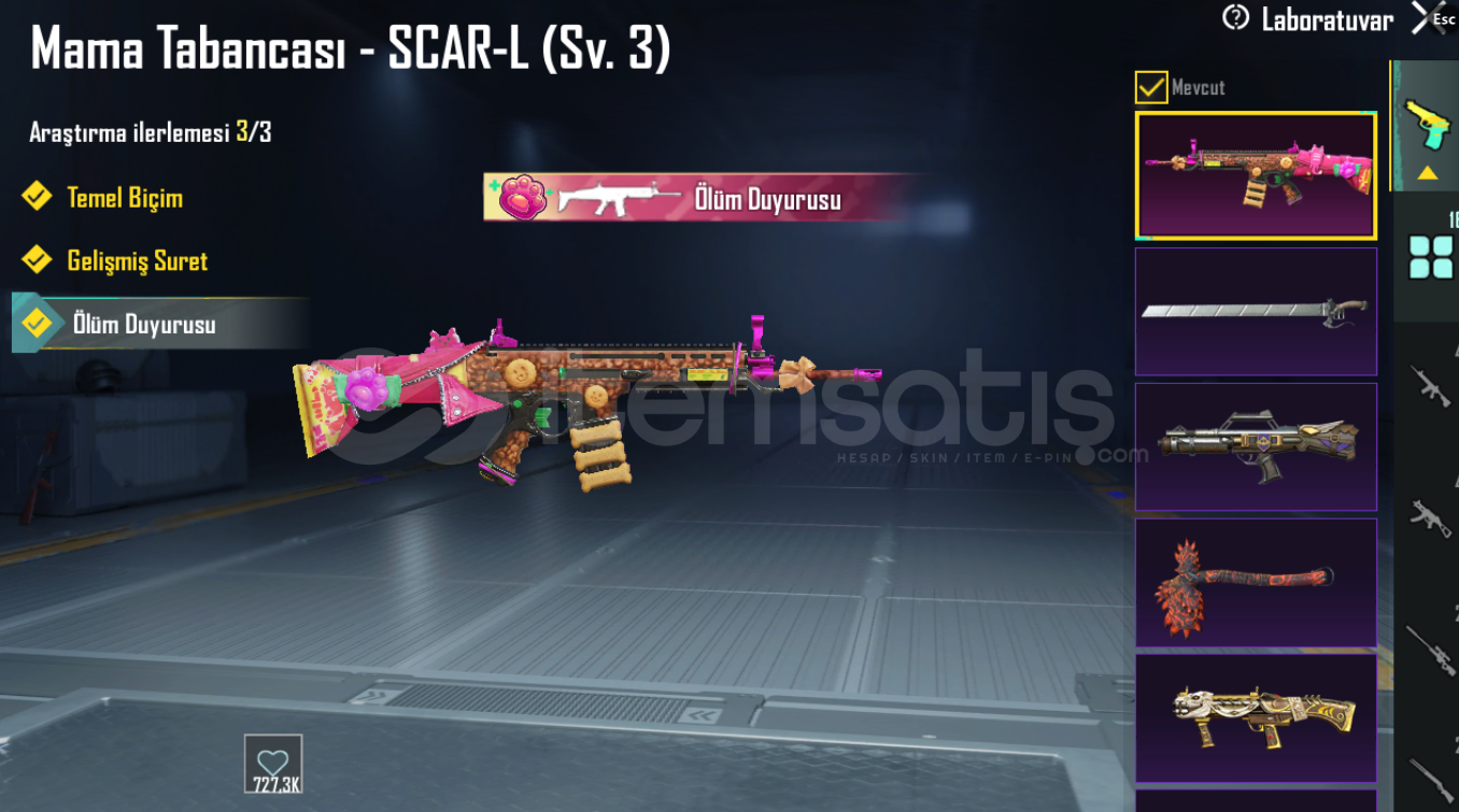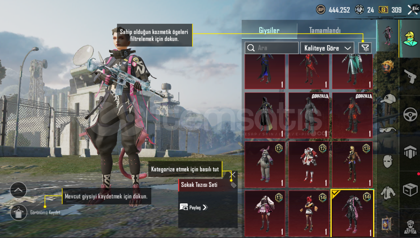 🔫 YÜKSELTEBİLİR SİLAHLAR • Buzdiyarı M416 – 5 Seviye • 8 Bitlik Patlama OMP – 3 Seviye • Zarif Leylak Thompson – Max Seviye • Gece Gladiatörü PP19 Bizon – Max Seviye • Mama Tabancası Scarlet – Max Seviye • Alevli Godzilla Savaş Baltası – 2 SeviyeEk Malzemeler: • 1 Adet Materyal • 3 Adet Materyal Parçası⸻🟣 ÖZEL DESTANSI SETLER •...