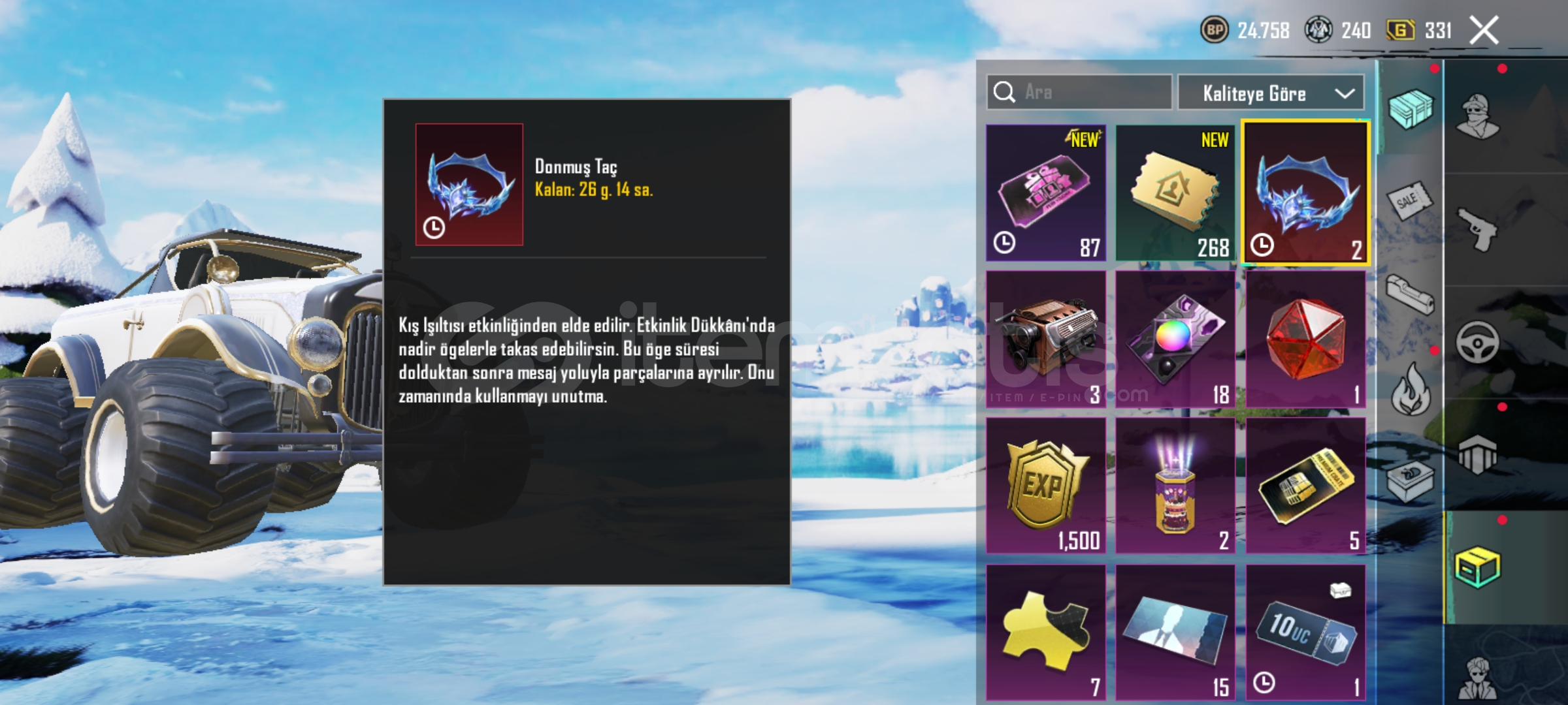 Buz 6Nihai setNihai maskeDikenli kaskÖlüm duyurulu umpE spor buggyE spor s12k vuruş lu ölüm duyuruluRp açık fullÖdül yolu açık fullBonus pass yarısı açık51 kol47 destansı dier rp de 50 oluyorBağlar temiz.Yeni nihai içinde 2 tane parça vardırAlana hayırlı olsun.