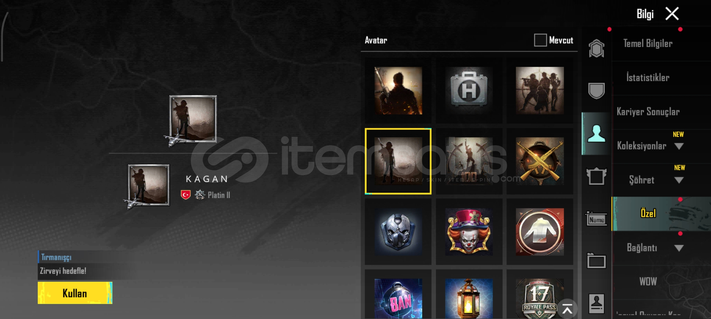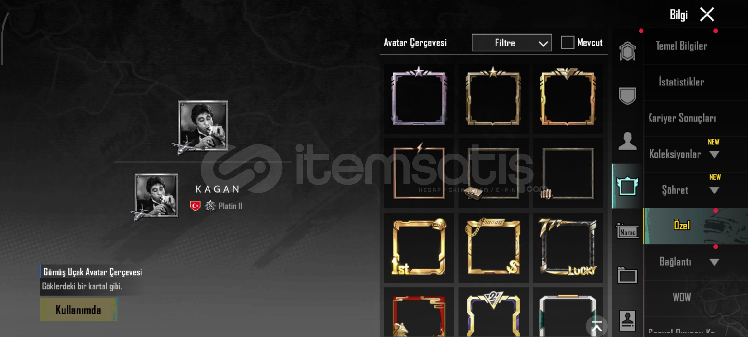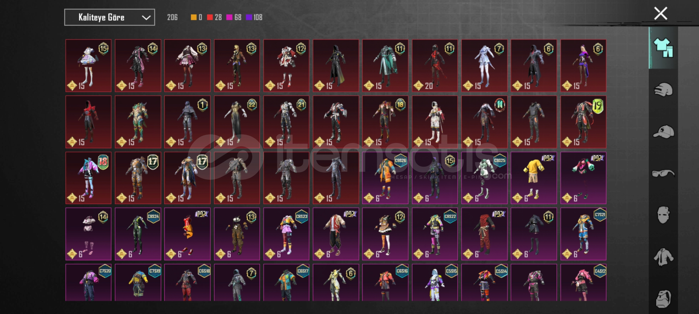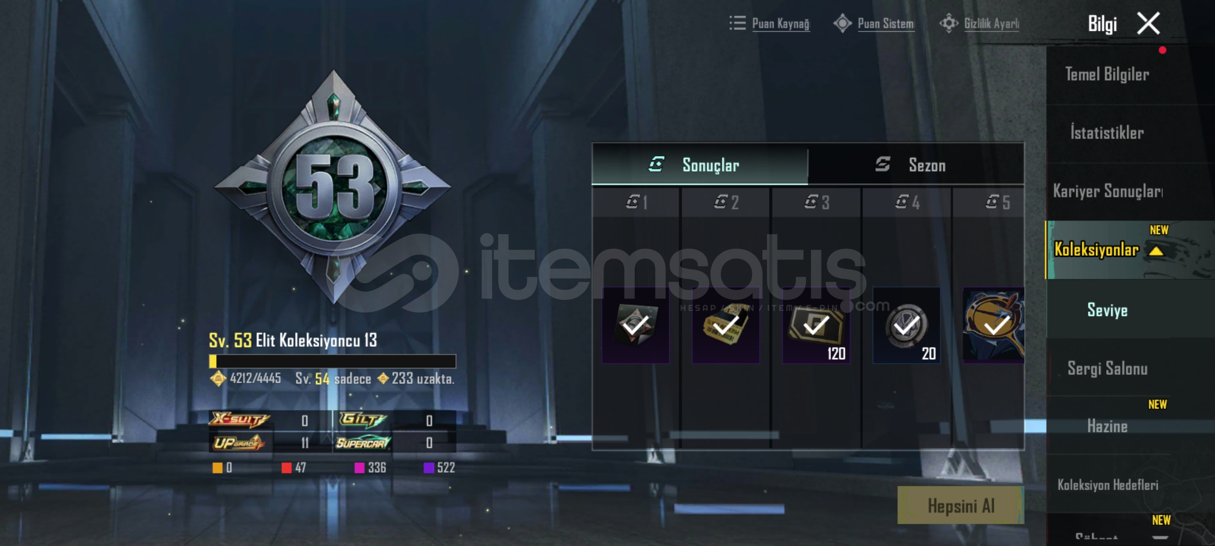 53 koleksiyon47 destanstlı12 yükseltilebilir78 seviyePilot çercevesi1 yıl dönümü çercevesiPlayer unknow üstüKomutan alt/üstAnanas alt/üstCrewS2 maskeAFA şapkasıViktoreyen kadın UAZSaha komutanı setiZırhlı avcı setiBuz diyarı M4 (5sv)Küçük Midilli m762 (4sv)8 bitlik patlama ump (3sv)Katil balkabağı groza (1sv)Rengarenk parıltı (1sv)Zarif leylak thampson (3sv...