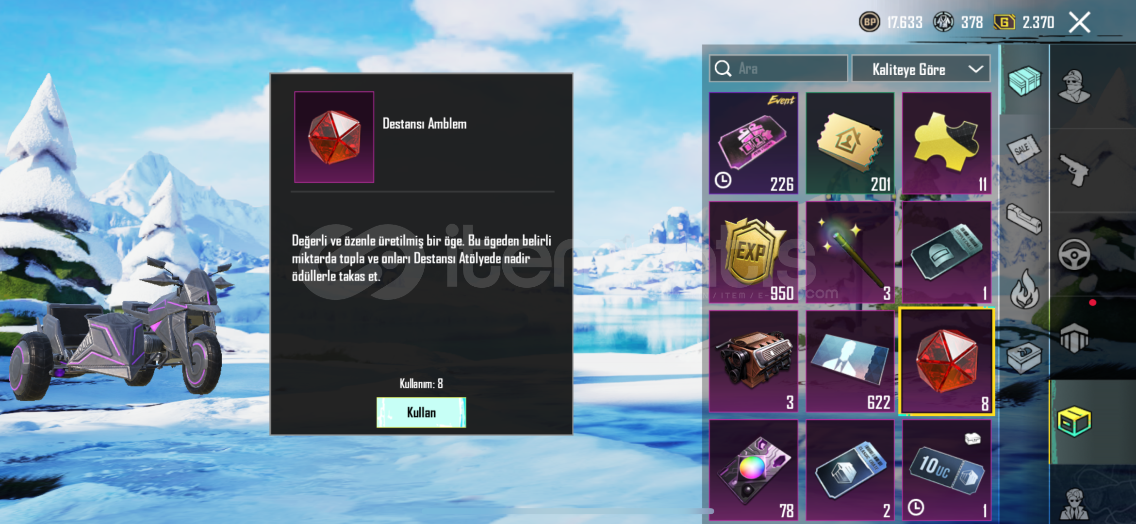 Pubg mobile buz diyarı 6 seviye hesapta rp, prime, prime plus açıktır ve hesapta 1000 uc var ve 8 destansı amblem var destansı gösteriş var 18 yükseltilebilir var çoğunda ölüm mesajı açık aklınızda soru varsa sormaktan çekinmeyin.Yükseltilebilir Silahlar Listesi• Küçük Midilli - M762 (Sv. 4)• Kış Kraliçesi M249 I (Sv. 1)• Baston Şeker -...
